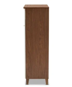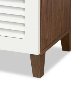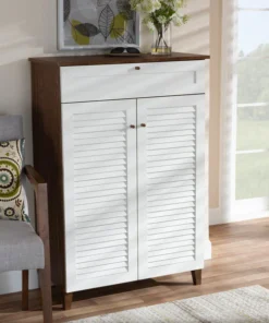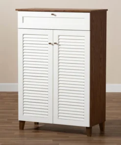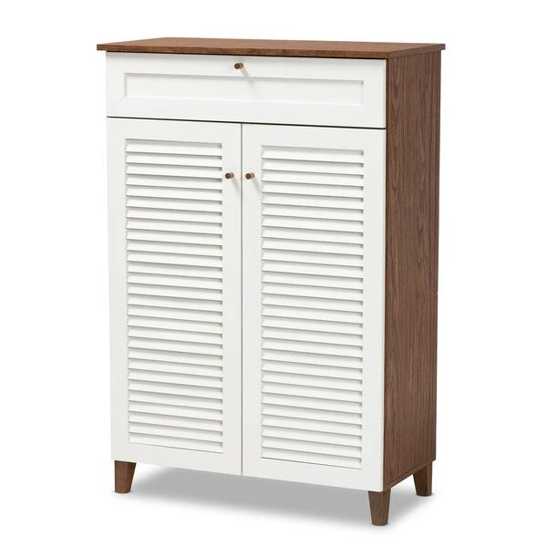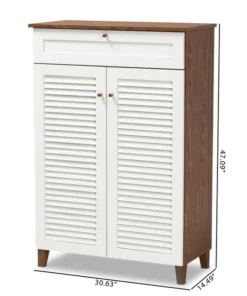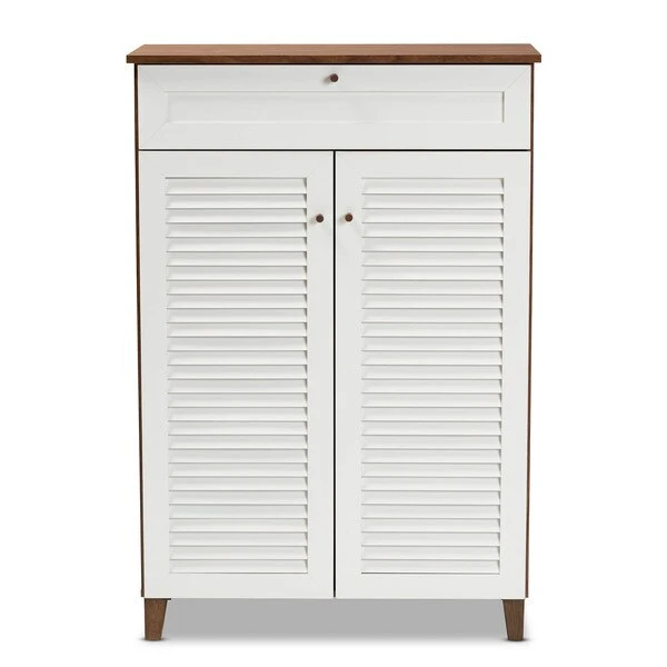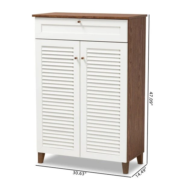 Store your shoes on the sly with the Coolidge shoe cabinet. Two slatted doors, fitted with round knobs, conceal five shelves with storage space for up to 15 pairs of shoes. One spacious drawer, accented with inset paneling, provides additional storage space for extra shoelaces and miscellaneous items. Tapered legs add refined style and provide elevation to deter dust buildup. Constructed from engineered wood, the Coolidge showcases a cool two-tone white and walnut brown finish that complements any color scheme. The Coolidge shoe cabinet requires assembly.