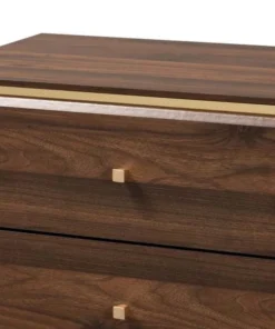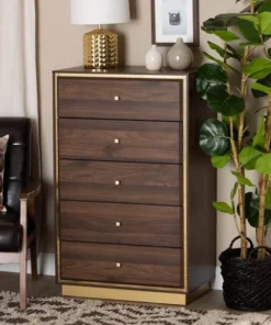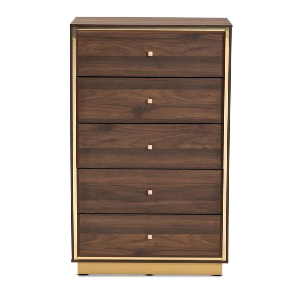 Baxton Studio Cormac Transitional Walnut Brown Finished Wood and Gold Metal 5-Drawer Storage Chest