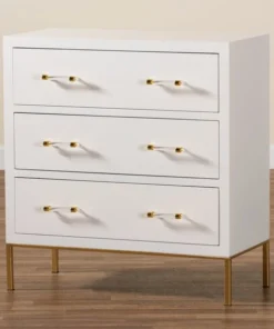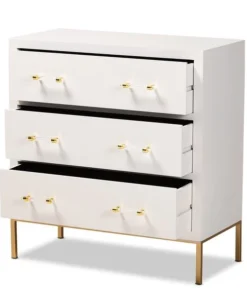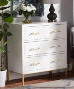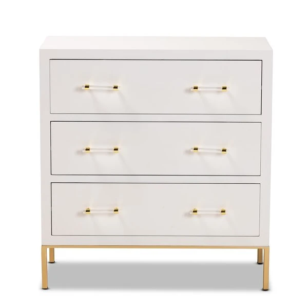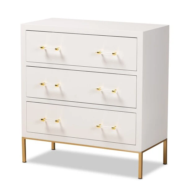 Keep your space organized with the glamourous Dante cabinet. Made in China, the Dante is constructed from sturdy wood finished in a brilliant white hue. Three wide drawers provide ample storage capability. Fully assembled, the Dante is set on brushed gold tone legs for a luxurious aesthetic. Clear acrylic and gold tone metal drawer handles lend an opulent touch, making the Dante cabinet a striking piece in any space.