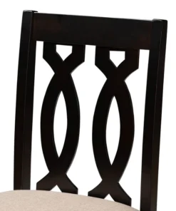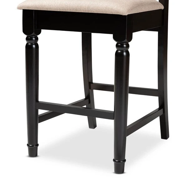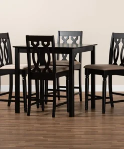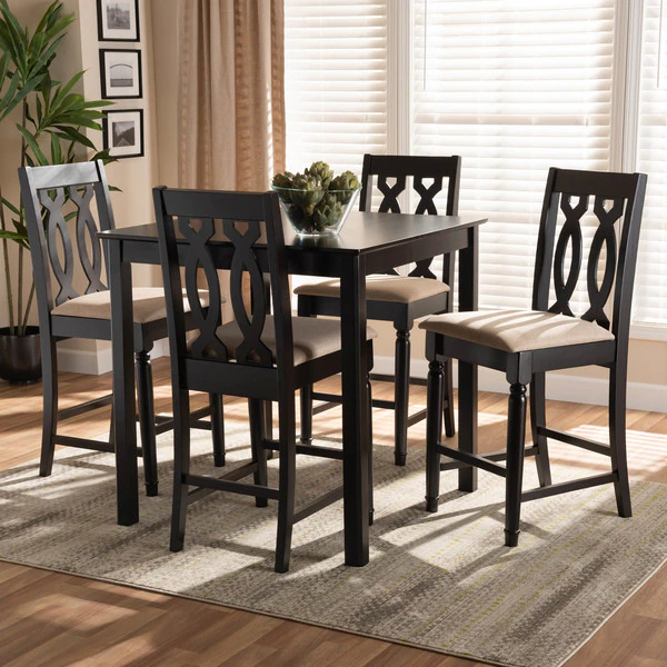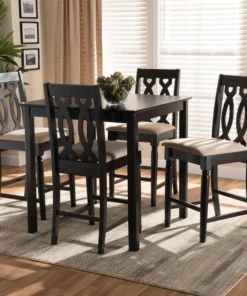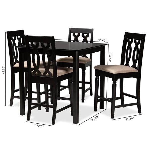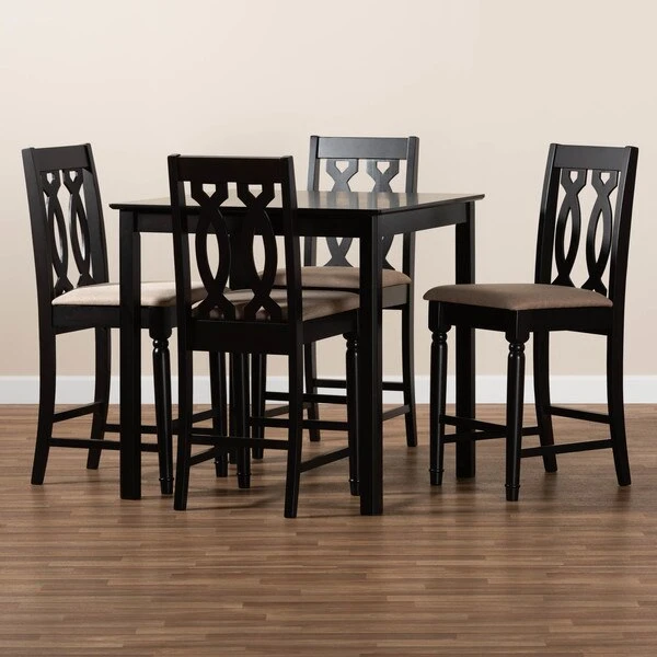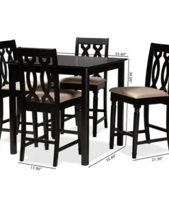 Timeless design meets modern comfort in the Darcie 5-piece pub set. Constructed from solid oak wood in an espresso finish, this pub set includes one table and four stools, each upholstered in a light polyester fabric that complements the dark wood finish. Padded with foam for the utmost comfort as you enjoy long dinners, each stool features a striking cut-out design on its back for enhanced visual appeal. Comfortable and stylish, the Darcie set is sure to elevate any dining experience. The Darcie 5-piece pub set requires assembly.