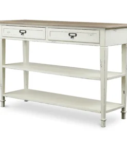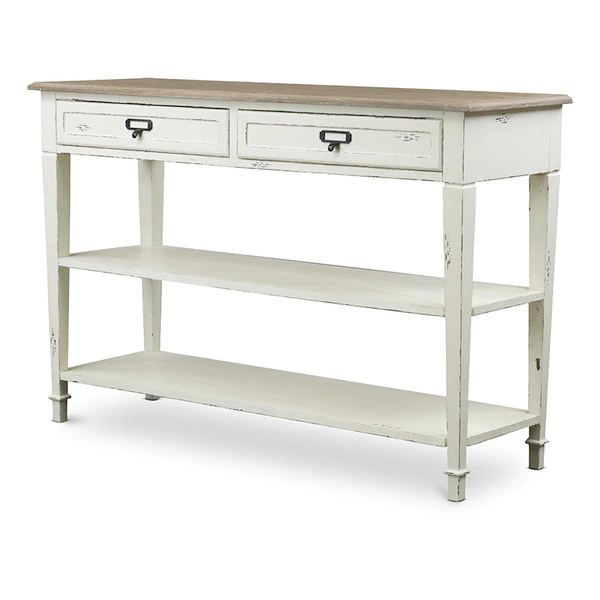 Boasting a white-streaked and distressed finish plus plenty of storage space via two drawers and two shelves, our Dauphine Traditional French Accent Console Table unifies fashion and functionality. The genuine mindi-wood top features a white-streaked natural veneer that pairs perfectly with the distressed white finishing that comprises the remainder of this console table. Black metal drawer handles offer attractive contrast. Superb value in a discount-furniture item.