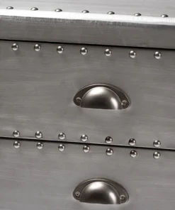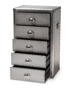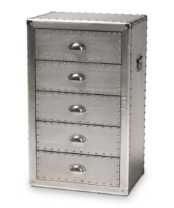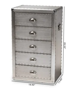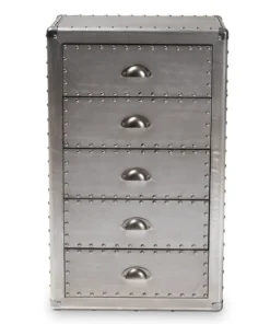 Bring chic French industrial style into your space with the Davet chest. Constructed from silver metal, the Davet features cool rivet detailing along its edges. Five drawers provide ample space to keep items organized and out of sight. Inspired by vintage storage trunks, the Davet features metal handles on either side, as well as corner protectors. Polished metal drawer pulls complete the look. Use this stylish piece as an end table in the living or as an accent piece in the entryway. The Davet chest will arrive fully assembled.
