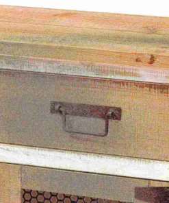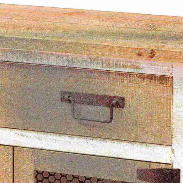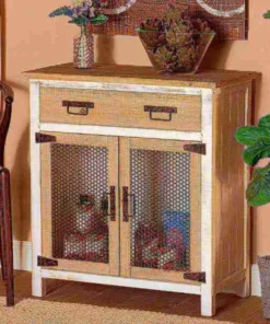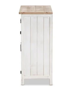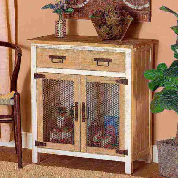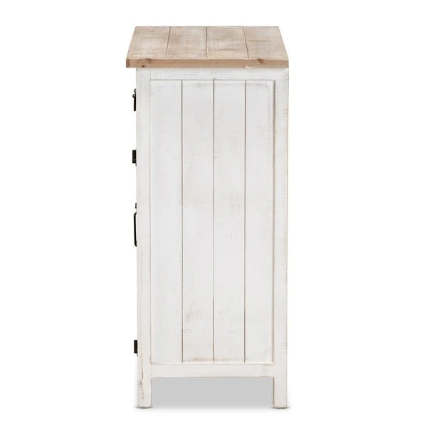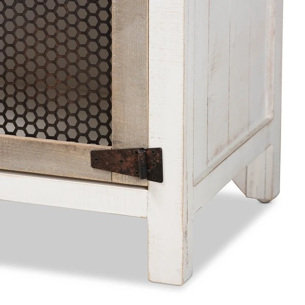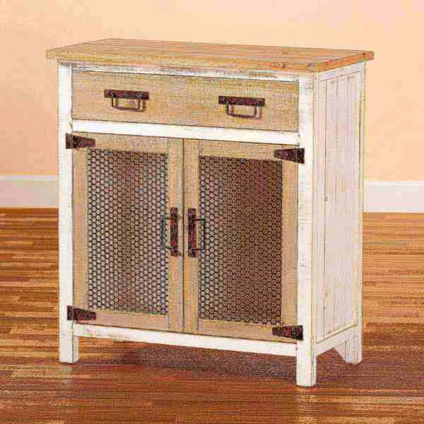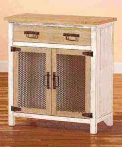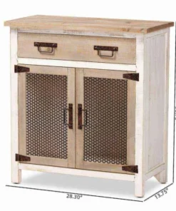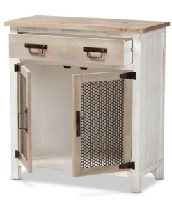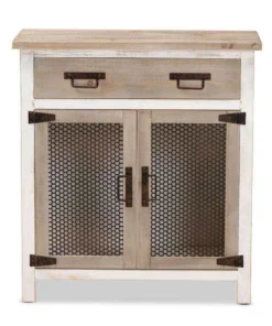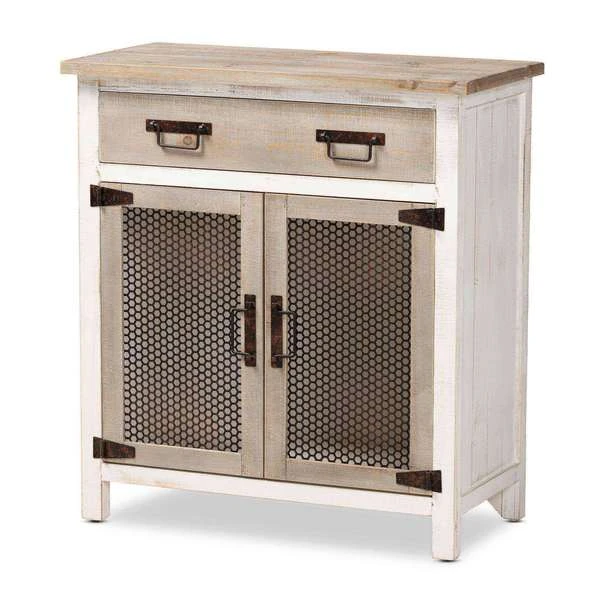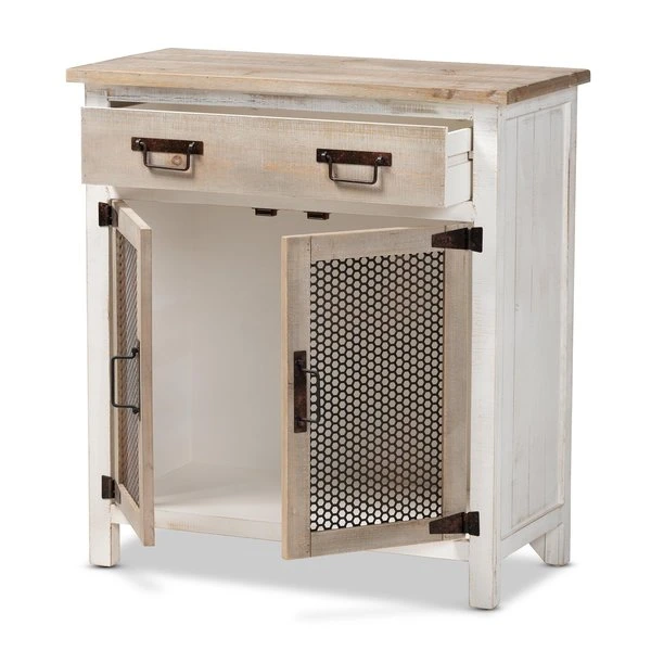 Renovate your kitchen or dining space with the convenient Deacon cabinet. Made in China, the Deacon is comprised of a sturdy wood frame showcasing a lightly weathered two-tone white and oak brown finish for an aged look. One drawer and a compartment behind two doors provide ample storage space to help organize busy areas. Fully assembled, the Deacon is accented with antique black rust tone metal door screens, handles, and hinges for a touch of industrial charm. A handy piece endowed with plentiful utility, the Deacon cabinet adds quality to any space.