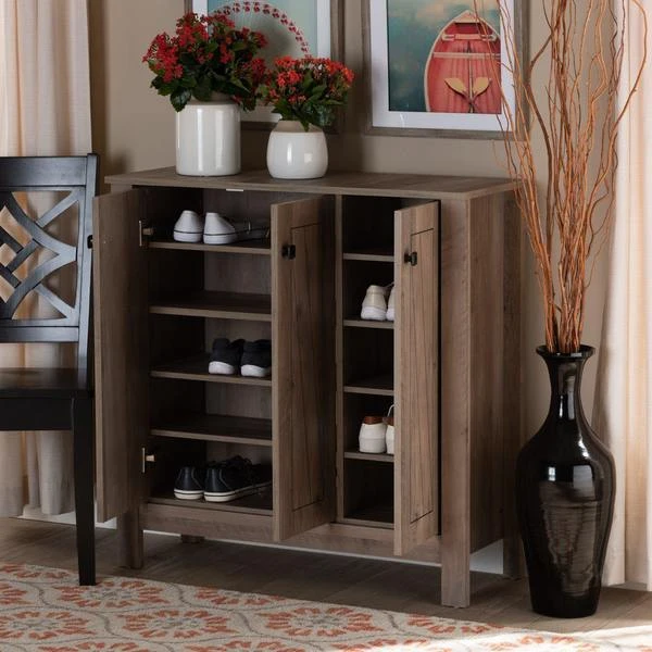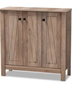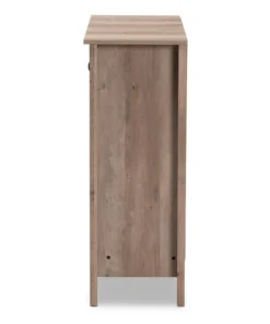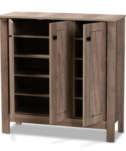 Update your entryway with the fantastic Derek shoe cabinet. Made in Malaysia, the Derek is constructed from sturdy wood showcasing a natural oak finish. Ten internal shelves provide room to place up to 15 pairs of shoes, depending on size. Requiring assembly, the doors feature an exquisitely carved design, as well as black finished square metal knobs for added visual appeal. A practical and stylish solution to overcrowded entrances, the Derek shoe cabinet is an excellent addition to any space.
