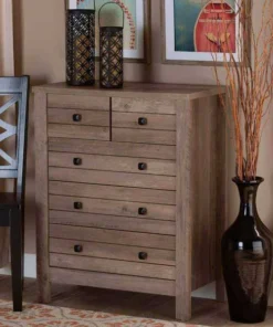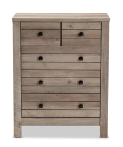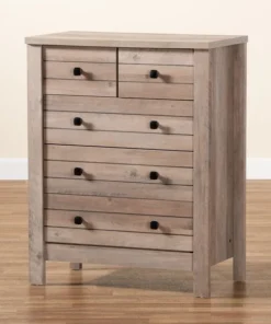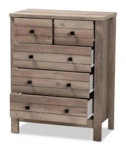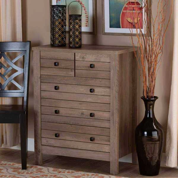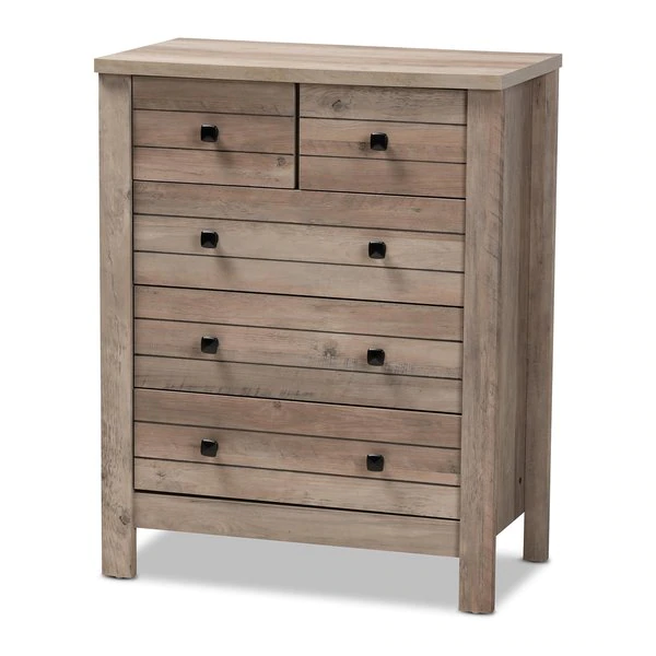 Add valuable storage to any space with the convenient Derek chest. Made in Malaysia, the Derek is constructed from sturdy wood showcasing a natural oak finish that easily coordinates with a large variety of existing color palettes. Three large drawers and two medium sized drawers provide ample storage for clothes, linens, and other various items. Requiring assembly, the Derek is ornamented with black finished square metal drawer handles that stand out brilliantly against the natural wood finish. Organize any bedroom in style with the Derek chest.