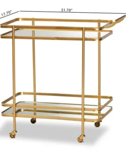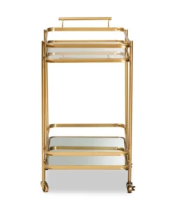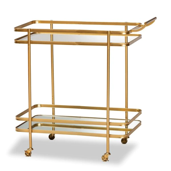 An exquisite design makes the Destin wine cart a perfect attendant to serve or display your wine collection. Made in China, the Destin is comprised of a stunning brushed gold finished metal frame fitted with two tiers of clear glass and mirrored glass shelves. The borders of each shelf are protected with guard rails to secure items. Fully assembled, the Destin rests on four caster wheels for versatile movement. A handy and visually striking serving station, the Destin wine cart is an excellent accessory for any enthusiast.