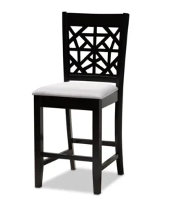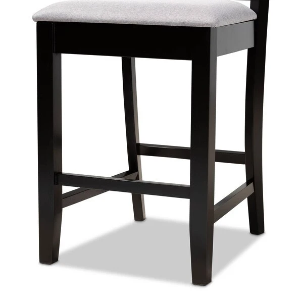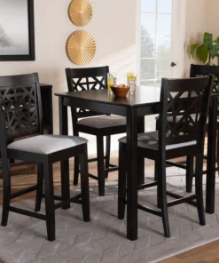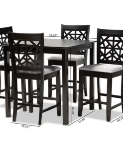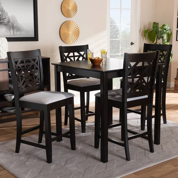 Enhance your dining experience with the modern design of the of the Devon 5-piece pub set. This set is constructed from sturdy wood in an espresso brown finish and comfortably seats up to four. The Devon requires assembly and includes one table with four foam-padded chairs upholstered in a soft fabric. A large, square tabletop along with ergonomic footrests provide the Devon with an excellent level of comfort. The intricate cut-out design on the back of the chairs allow light to flow throughout the dining room, making the Devon set the perfect choice to elevate any dining space.