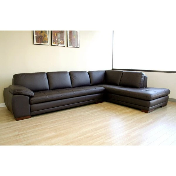 Comfort, style, and a versatile design – what more could you want in a sectional sofa? This 2-piece leather sectional can easily remain the centerpiece of a room that changes over time alongside your personal style. All the seating surfaces of the sectional are upholstered with rich brown genuine leather. Rest assured your new purchase is constructed with only the best materials – the frame is solid kiln-dried hardwood and the interior cushioning is made of high-density polyurethane foam. Further support is given by the built-in rubber webbing inner supports. Only light assembly is required – the wooden feet will need to be attached. This sectional is surely contemporary seating at its finest, and one of our most popular designs. Features: – Leather, with a leather match on the backs and sides – Kiln dried hardwood frame – High density polyurethane foam cushioning – Rubber webbing inner support system – Metal bracket can be used to connect the sofa to the chaise – Brown hardwood feet