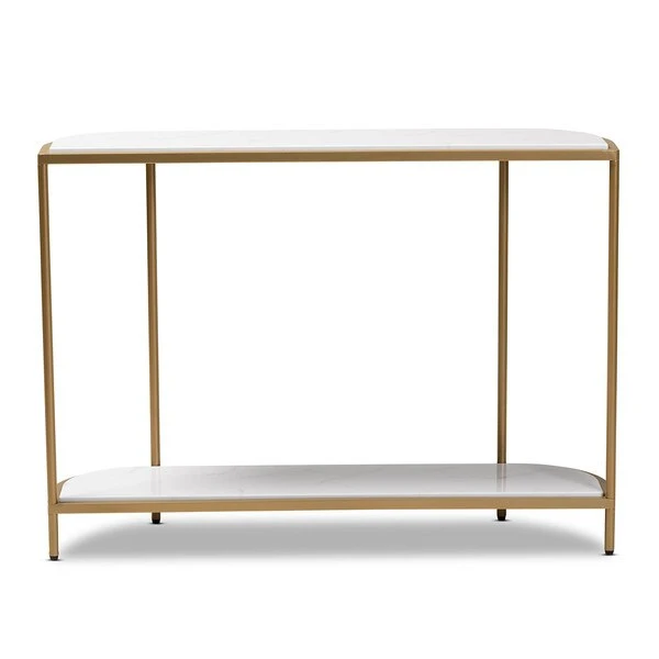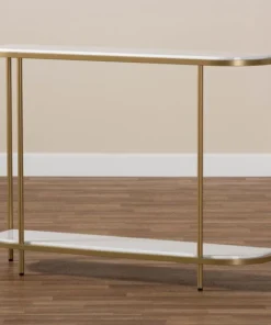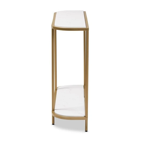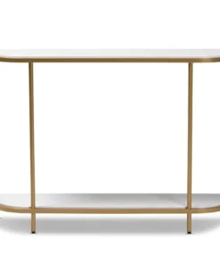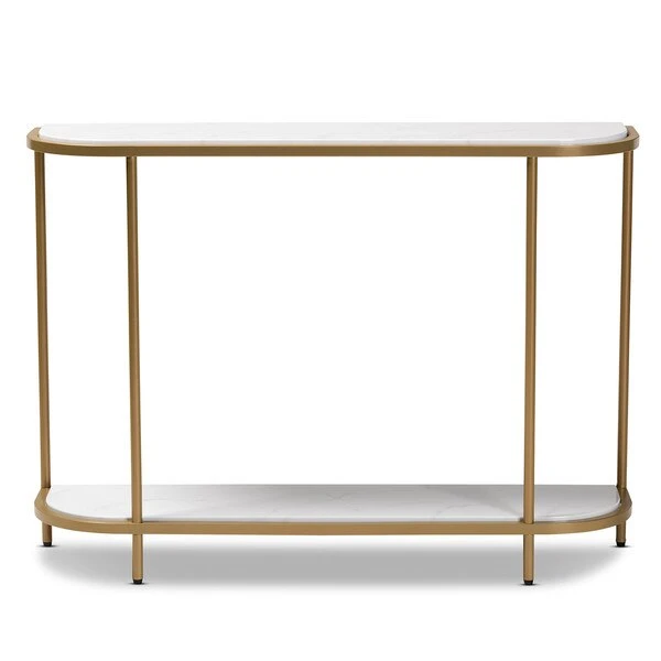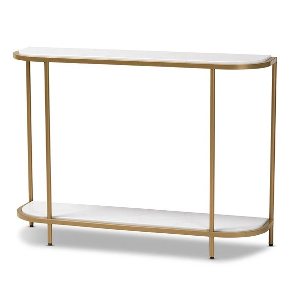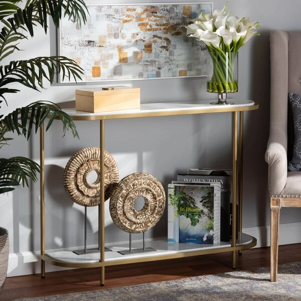 Cultivate an air of luxury in your space with the Dominic console table. The Dominic is comprised of a minimalist gold finished metal frame and two oval-shaped faux marble shelves. The slim silhouette and additional lower shelf of the Dominic allow for easy decluttering of busy areas. Requiring assembly, the Dominic is fitted with black non-marking feet for easy transport and rearrangement. Easily declutter your space in glamorous style with the Dominic console table.