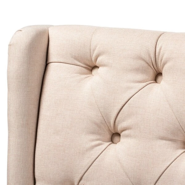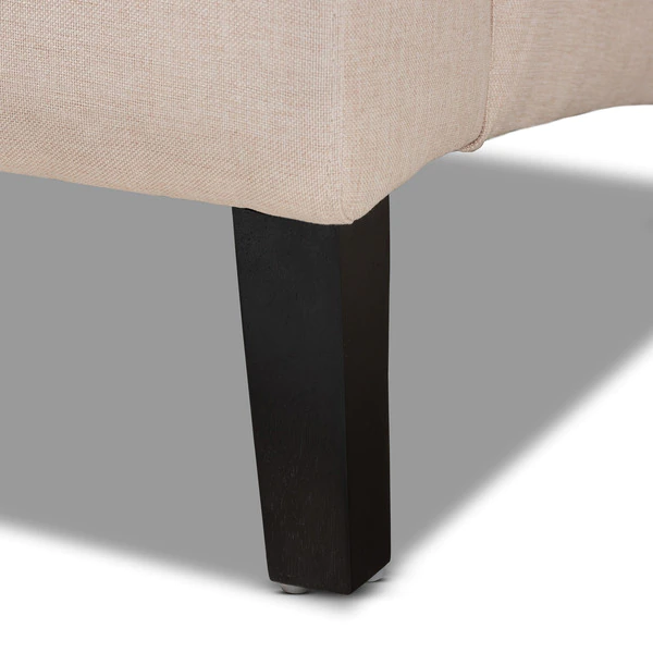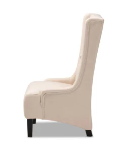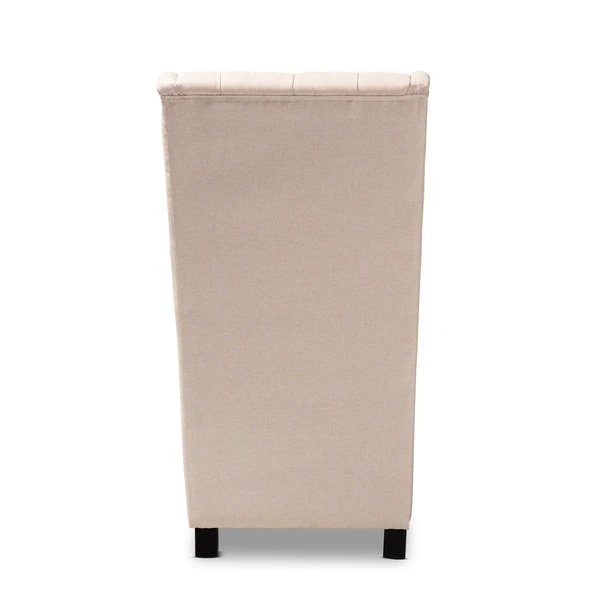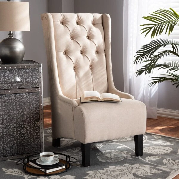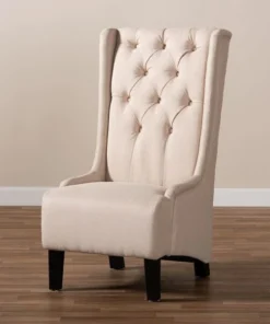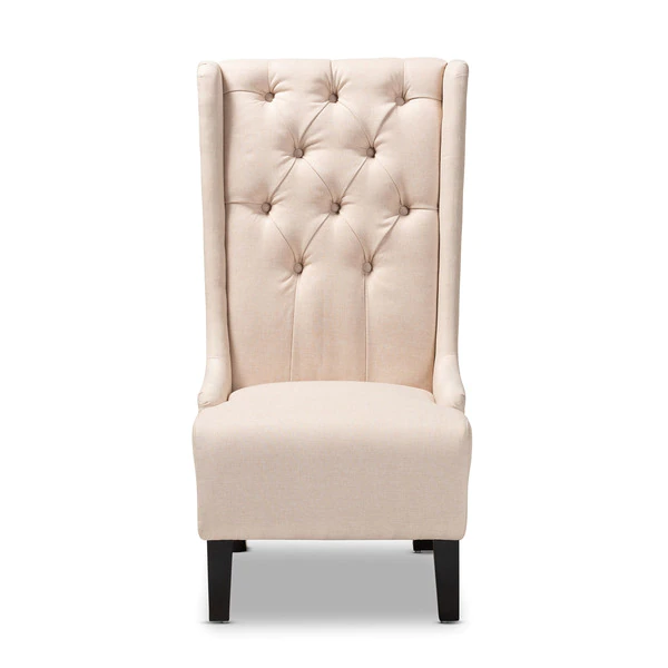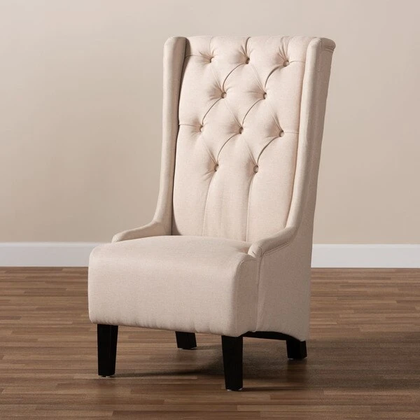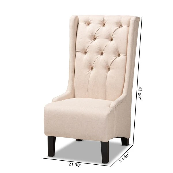 Traditional button tufting is paired with an extra tall backrest to make the Dorais chair a unique addition to any living space. Constructed from eucalyptus wood, the Dorais is upholstered in a soft, durable linen polyester fabric and padded with foam for the utmost sitting comfort. Black finished legs add chic contrast. This regal piece is sure to enhance the elegance of any living room or lounge space. The Dorais chair will arrive fully assembled.