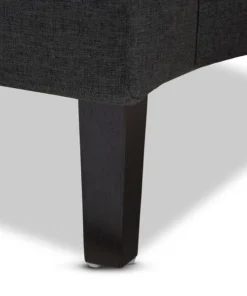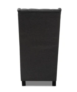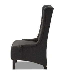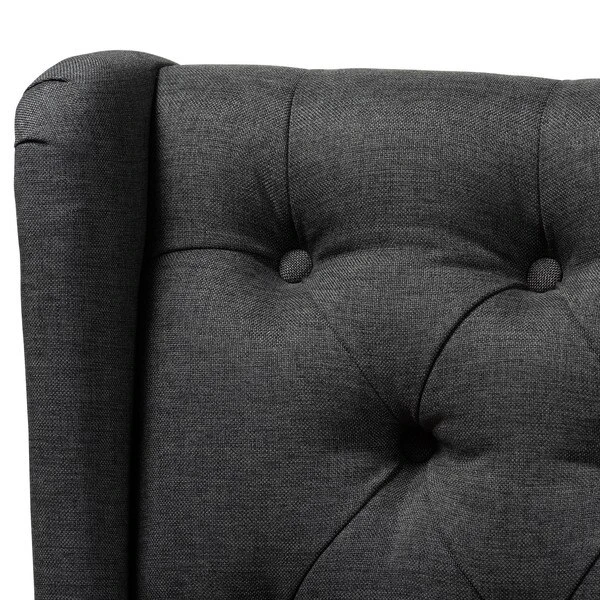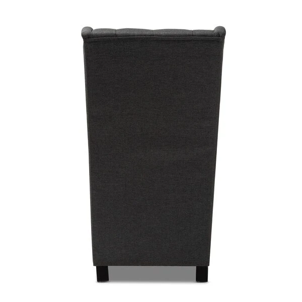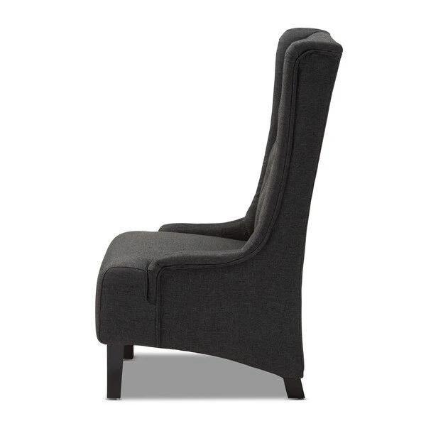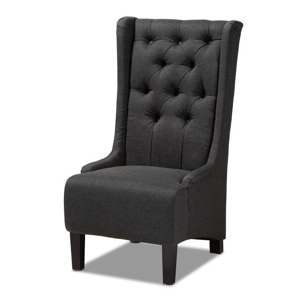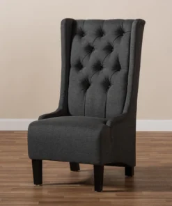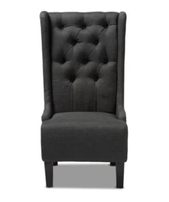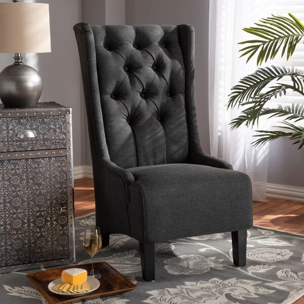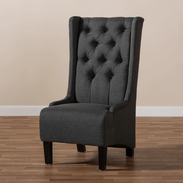 Traditional button tufting is paired with an extra tall backrest to make the Dorais chair a unique addition to any living space. Constructed from eucalyptus wood, the Dorais is upholstered in a soft, durable linen polyester fabric and padded with foam for the utmost sitting comfort. Black finished legs add chic contrast. This regal piece is sure to enhance the elegance of any living room or lounge space. The Dorais chair will arrive fully assembled.
