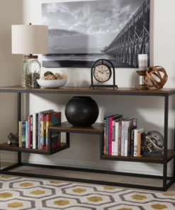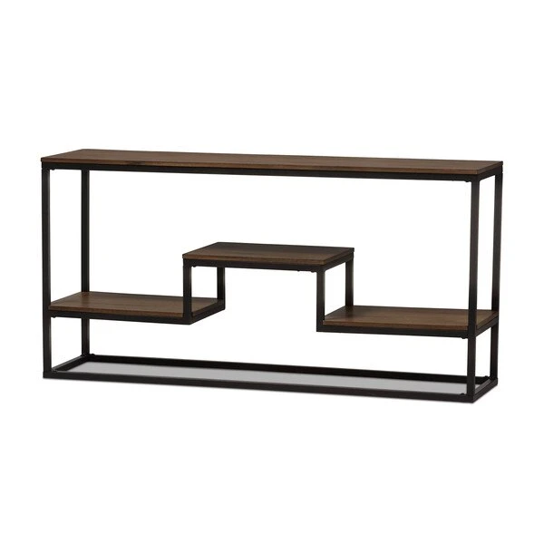 Featuring weathered oak in an aged and rustic charm, the Doreen's Industrial look and angular shelf makes it a console with character. Constructed of tubular metal and finished in black textured finished, the Doreen will add some rustic charm to your home. Mixing distressed wood and metal, this aesthetic is both edgy and stylish. Featuring three fixed shelves, the Doreen is perfect for entryway to hold everyday belongings and cut the clutter in your home. The Doreen console table requires assembly.