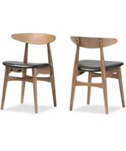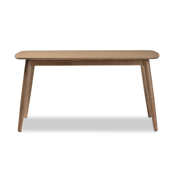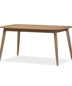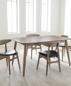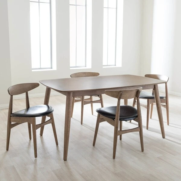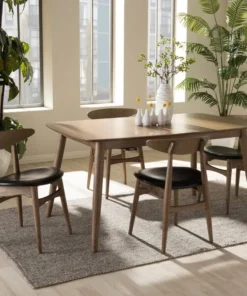 An inviting design that shifts shape to suit the occasion, the Flora mid-century modern 5-piece dining set features contemporary profile made up of soft curves and angled lines. Designed to seat four to six guests, the rounded edges and French oak veneered surface of this table top are made of solid rubberwood in French oak finishing to create a retro modern look that works in any space. Outward facing, tapered rubberwood legs are set at an angle, giving the table a distinctive profile that pairs perfectly with Flora dining chair. The four piece matching dining chairs features the same finishing in solid rubberwood. Upholstered faux leather seat provides a comfortable seat with the curved-back support. The clean lines, and supple working of this elegant 5-piece dining set evokes functional furniture and works great in contemporary family homes, whether it’s a French country feel or rugged Scandinavian look. The dining set requires assembly.