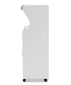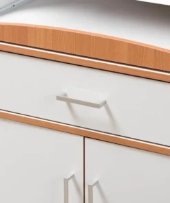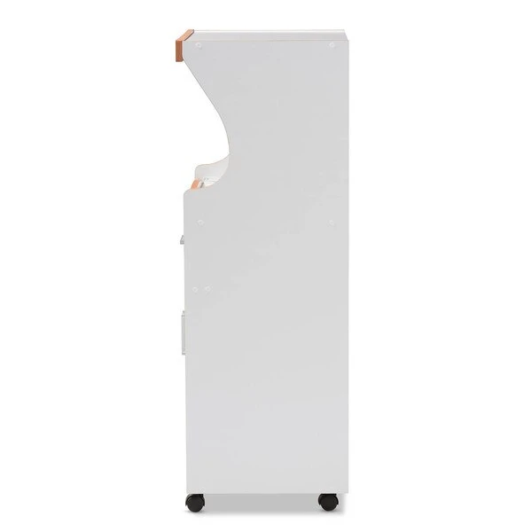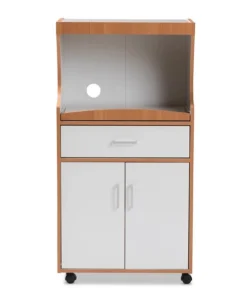 Add both practicality and style to your kitchen or dining room with the Edonia kitchen cabinet. The modern and contemporary-inspired design is clear to see in the rectangular silhouette and subtle grooved features. The Edonia is finished in white with beech brown wood finishing on the edges for a two-tone look. The cabinet features two shelf spaces behind discreet doors, and a drawer on top of them for additional storage. The Edonia's top compartment has ample space for a microwave, with a cut-out in the back panel for wire management. Even more convenient, the space for the microwave is on a pull-out tray, moving smoothly on drawer sliders. The Edonia comes with castors for mobility, so this cabinet can provide storage for utensils and dishware, and can be moved easily for cleaning. The kitchen cabinet requires assembly.