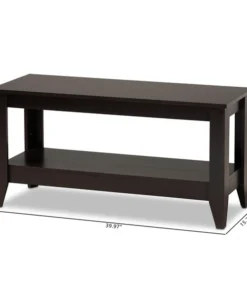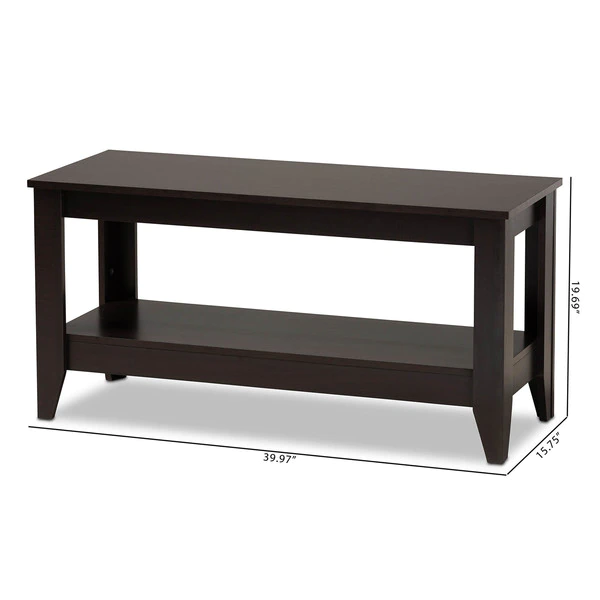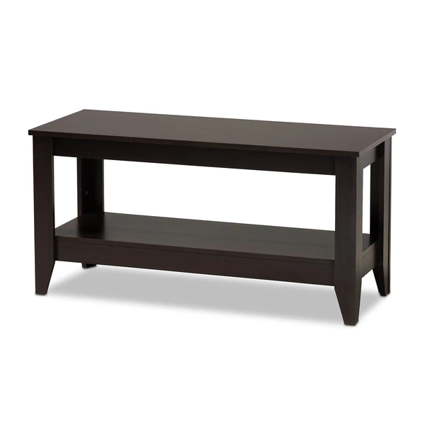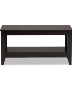 The clean, streamlined design of the Elada coffee table makes it an easy addition to any living room. This wood table features a spacious tabletop, perfect for a potted plant and a cup or two or espresso. A lower shelf provides space to display books, magazines, and more. Its dark wenge brown finish and tapered legs give the table an elegant, modern feel. The Elada coffee table requires assembly.