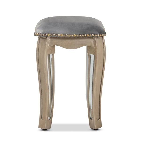 Baxton Studio Elgin Glam and Luxe Grey Velvet Upholstered Brushed Silver Wood and Mirrored Glass Ottoman Stool