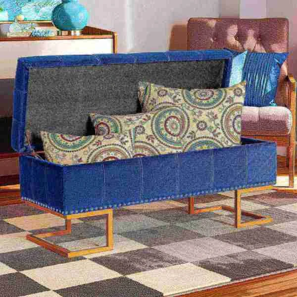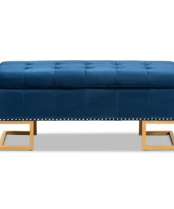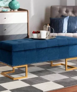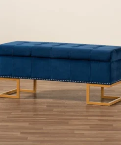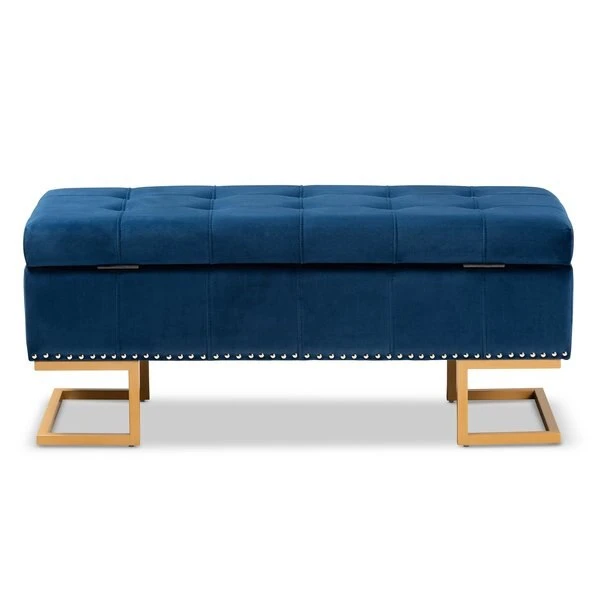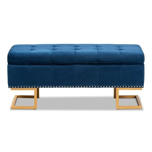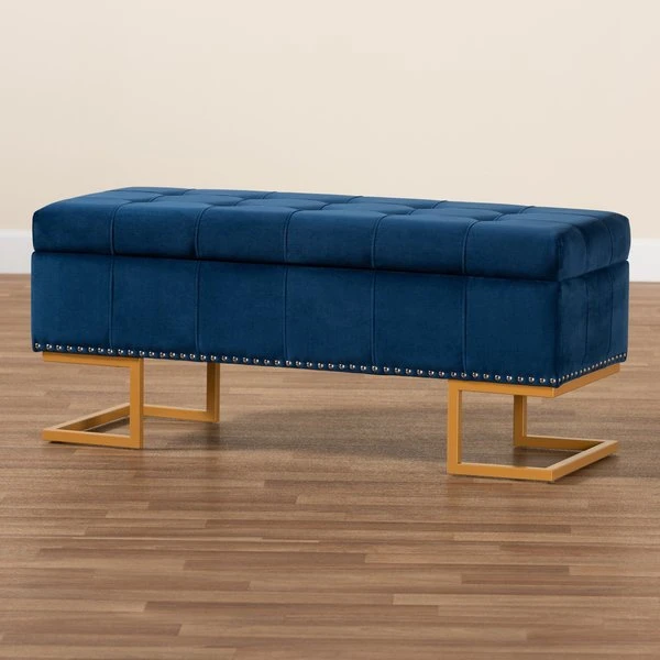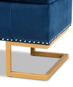 Luxurious seating doubles as practical storage in the versatile Ellery ottoman. Made in China, the Ellery is comprised of a sturdy wood frame padded with soft foam and upholstered in smooth velvet fabric. Its lift up top reveals ample storage space for extra blankets and linens. Requiring assembly, the ottoman is set on a stunning gold finished metal base that lends a glamourous aesthetic. Button tufting and silver finished metal nailheads add modern style, making the Ellery ottoman an eye catching addition to any space.