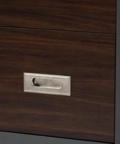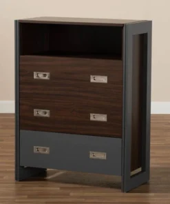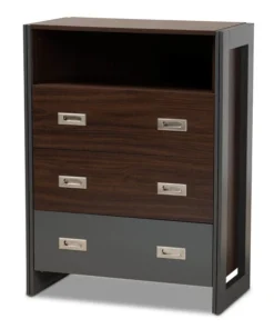 Add visual interest and storage to your bedroom with the Elliot chest. This wooden chest showcases a two-tone grey and walnut brown finish for a cool, contemporary feel. Three drawers provide ample space to store clothes, while an open shelf provides space to display books and decor. Each drawer is fitted with metal glides for smooth movement. Silver metal handles and inset detailing on the sides lend a sleek touch. Requiring assembly, the Elliot chest is the answer to all your bedroom storage needs.