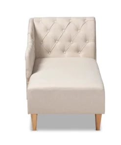 Lounge in style and comfort with the Emeline chaise. This Victorian-inspired chaise features a graceful scroll back and single arm that display lavish button tufting. Designed to add both elegance and function to your space, the Emeline is crafted from sturdy wood and upholstered in a soft, foam filled fabric for the utmost relaxation. The chaise is set on top of tapered, oak finished legs, adding a modern twist to this classic chaise. The Emeline chaise requires assembly.