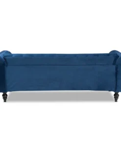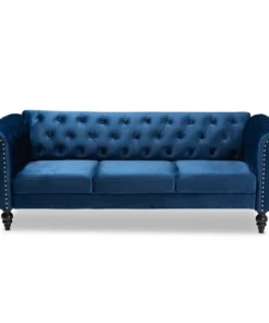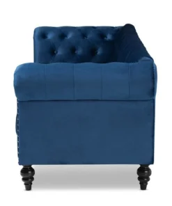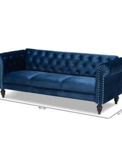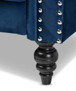 The classic chesterfield sofa receives a modern twist with the Emma sofa. This distinctive piece is upholstered in a soft, sumptuous velvet fabric and padded with plush foam. Elegant button tufting and rolled arms allude to traditional design, while silver metal nailheads lend a modern touch. Exquisite black ring turned feet complete the look of this stylish sofa. The Emma sofa requires assembly.