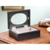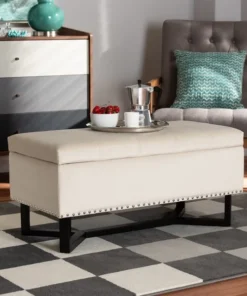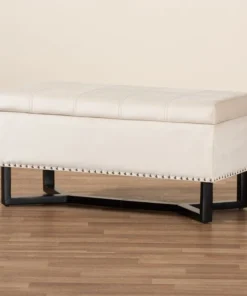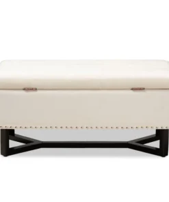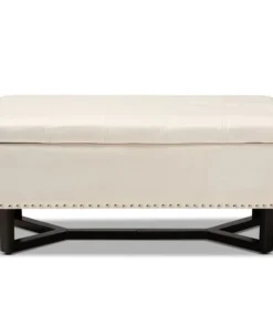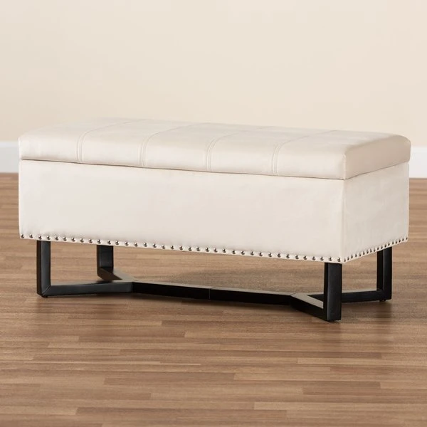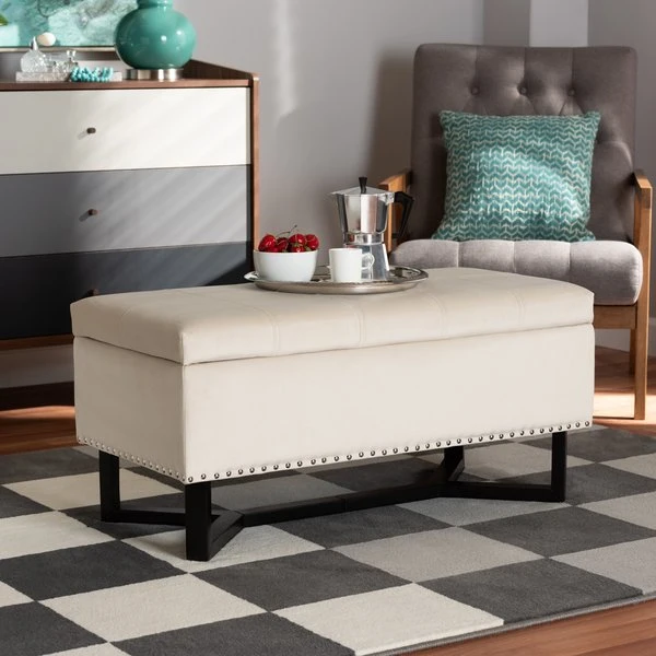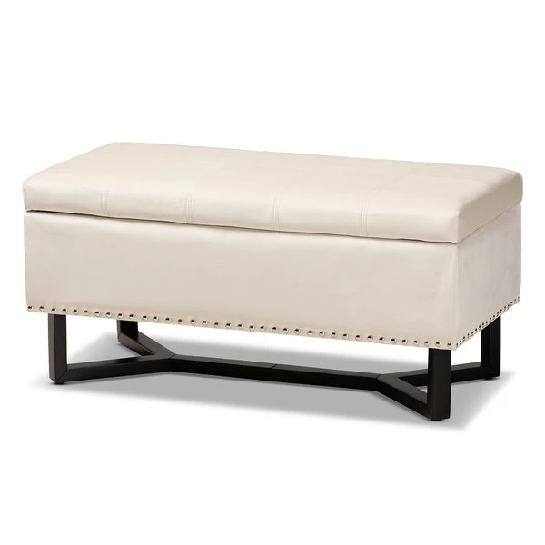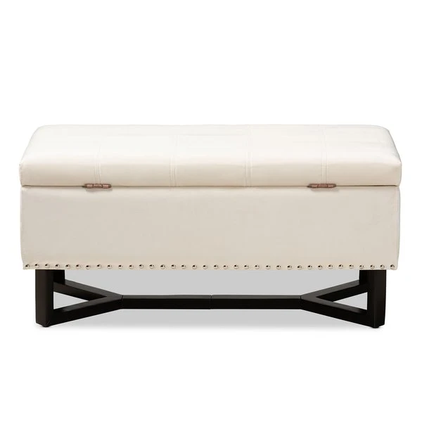Add a tranquil accent to your space with the Esther ottoman. Made in China, the Esther is comprised of a sturdy wood frame padded with soft foam and upholstered in smooth velvet fabric. Its lift up top reveals a spacious storage compartment for extra blankets and linens. Requiring assembly, the ottoman is set on a dark brown finished wood base that lends an elegant aesthetic. Grid stitching and silver finished metal nailheads add modern style, making the Esther ottoman an eye catching addition to any space.