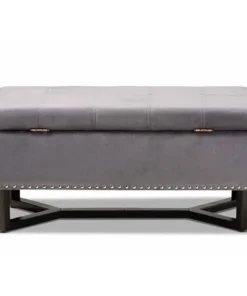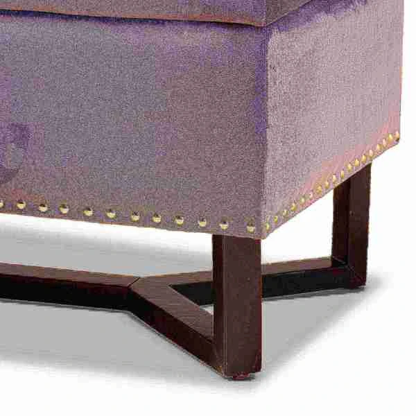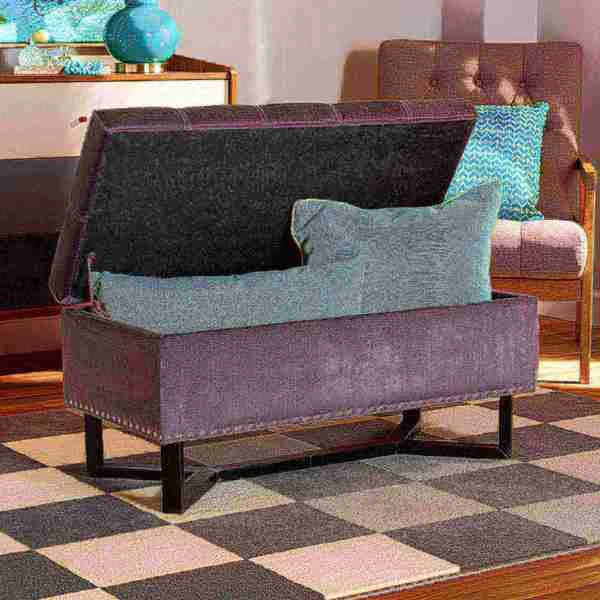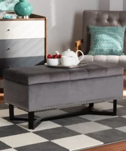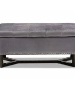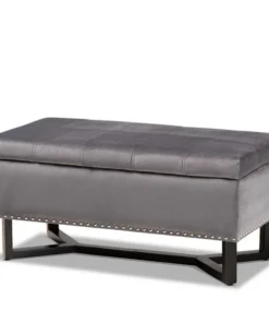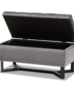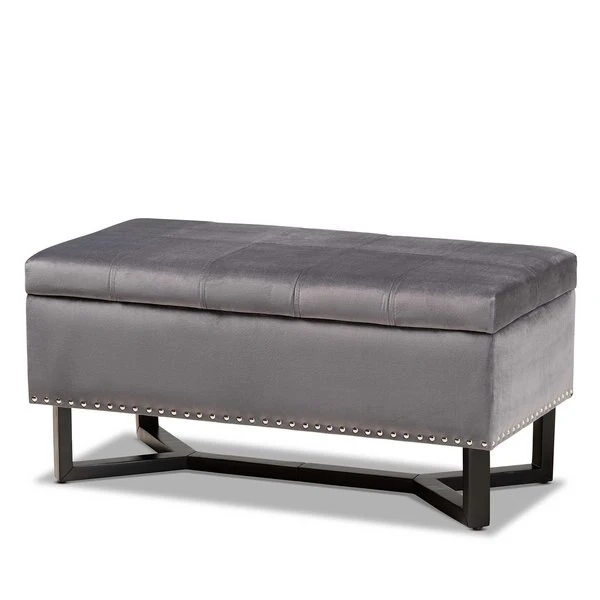 Add a tranquil accent to your space with the Esther ottoman. Made in China, the Esther is comprised of a sturdy wood frame padded with soft foam and upholstered in smooth velvet fabric. Its lift up top reveals a spacious storage compartment for extra blankets and linens. Requiring assembly, the ottoman is set on a dark brown finished wood base that lends an elegant aesthetic. Grid stitching and silver finished metal nailheads add modern style, making the Esther ottoman an eye catching addition to any space.