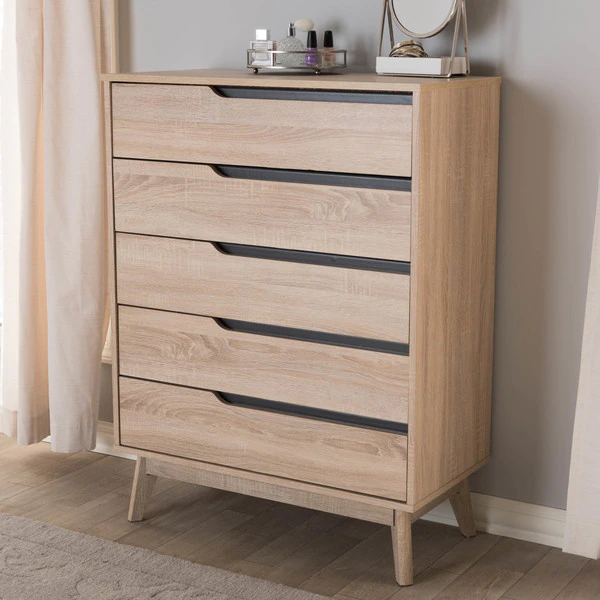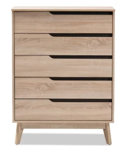 A perfect blend of classic and modernity, the Fella collection showcases pattern played with clever balance of colors and sleek surface. Constructed of engineered wood in oak and grey two-tone finishing, the Fella 5-drawer chest reveals a fresh and relaxing look. Angled legs complements the piece of furniture for superior support and style. Five drawers open to reveal storage room for linen and clothes. With practicality, the inset handles in grey wood finish contrasts with the oak surface for a contemporary, Scandinavian aesthetic in your home. The Fella 5-drawer chest requires assembly.