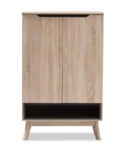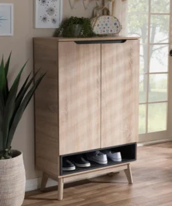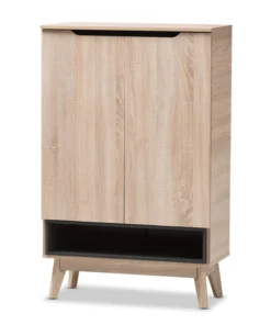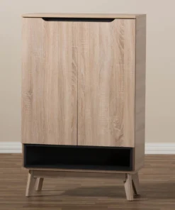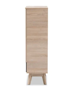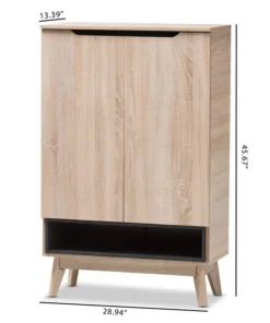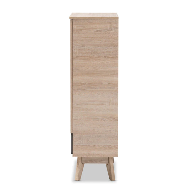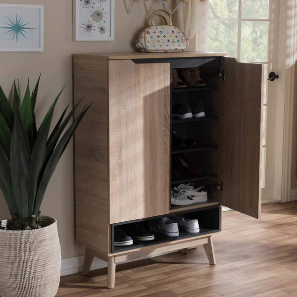 A perfect blend of classic and modernity, the Fella collection showcases pattern played with clever balance of colors and sleek surface. Constructed of engineered wood in oak and grey two-tone finishing, the Fella 5-drawer chest reveals a fresh and relaxing look. Angled legs complements the piece of furniture for superior support and style. Two doors open to reveal storage room for shoes. With practicality, the inset handles and the open shelves in grey wood finish contrasts with the oak surface for a contemporary, Scandinavian aesthetic in your home. The Fella 2-door shoes storage cabinet requires assembly.