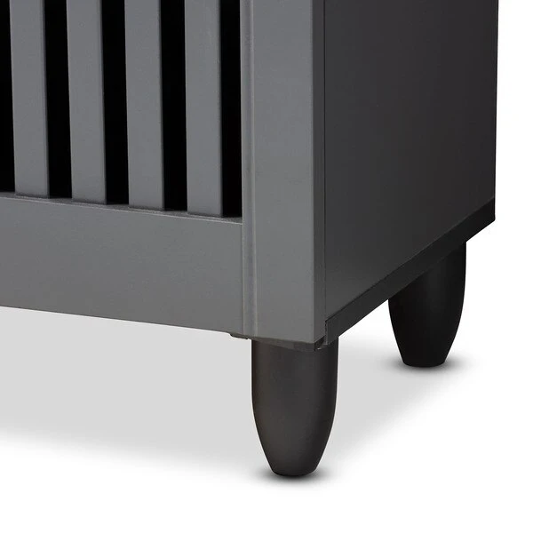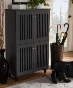 Featuring a modern design and ample storage space, the Fernanda cabinet will upgrade your shoe storage. Four doors conceal four shelves with storage space for up to 18 pairs of shoes. The doors feature open slats to enable air circulation and prevent mold growth on your shoes. Tapered legs provide elevation for easy dusting. The Fernanda cabinet requires assembly.