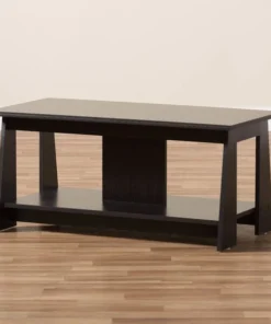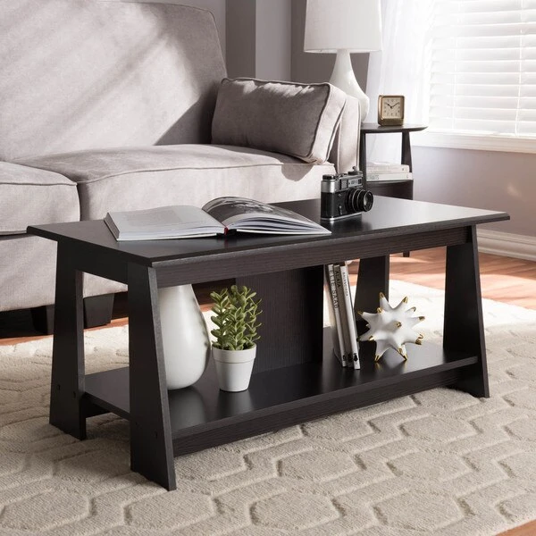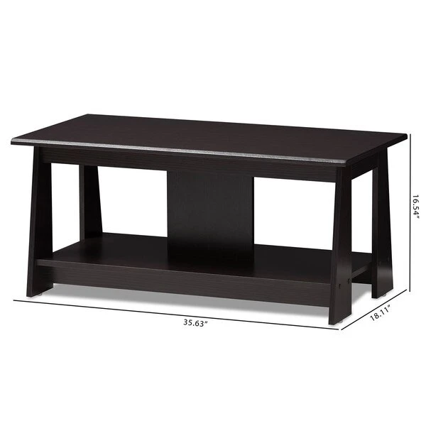 The sleek, energetic look of the Fionan coffee table practically begs to show-off its style. The modern and contemporary-inspired design emphasizes clean lines and open spaces. The Fionan has an all-over wenge brown wood finish. The coffee table features a rectangular table top perched on sawhorse style tapered legs. The Fionan also features an open shelf space with a partial divider under the table top, giving you endless possibilities for storage or displaying decor. This dynamic coffee table will help you pull the look of your livingroom together. The Fionan requires assembly.
