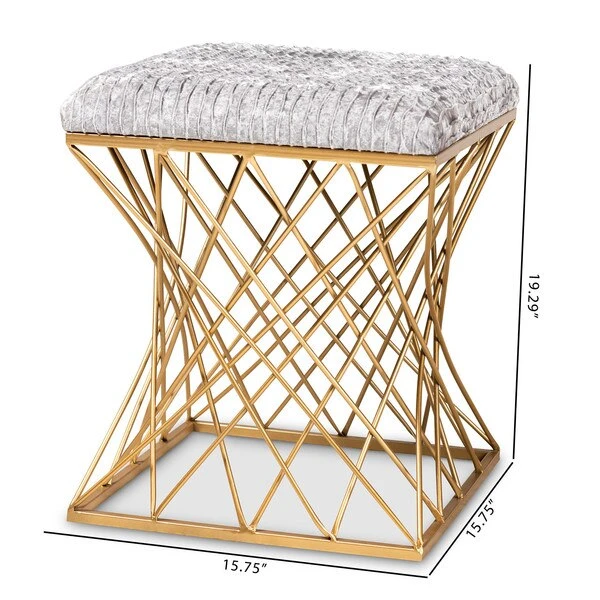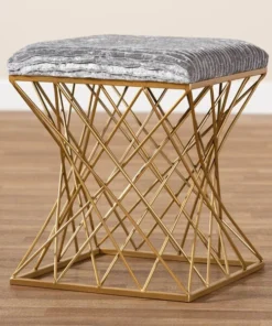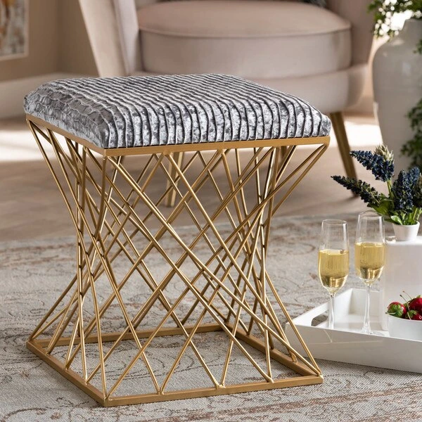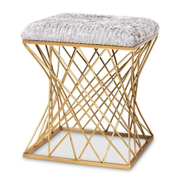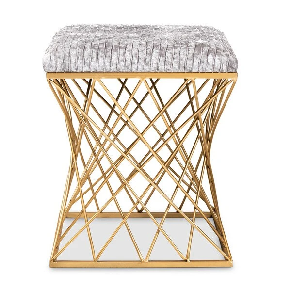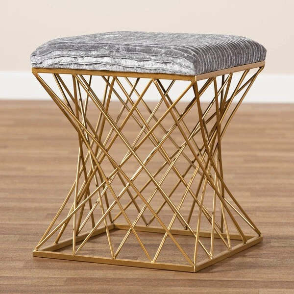 Add a hint of glamour to your space with the Fiore ottoman. This metal ottoman features a striking gold-toned geometric base that displays exquisite craftsmanship. The seat is upholstered in a grey crushed velvet fabric and features ripple-effect piping for a touch of texture and visual interest. Use this chic ottoman as a vanity seat or as a footstool. The Fiore ottoman will arrive fully assembled.