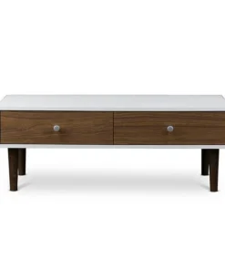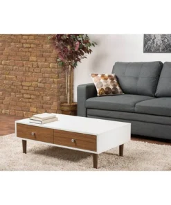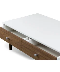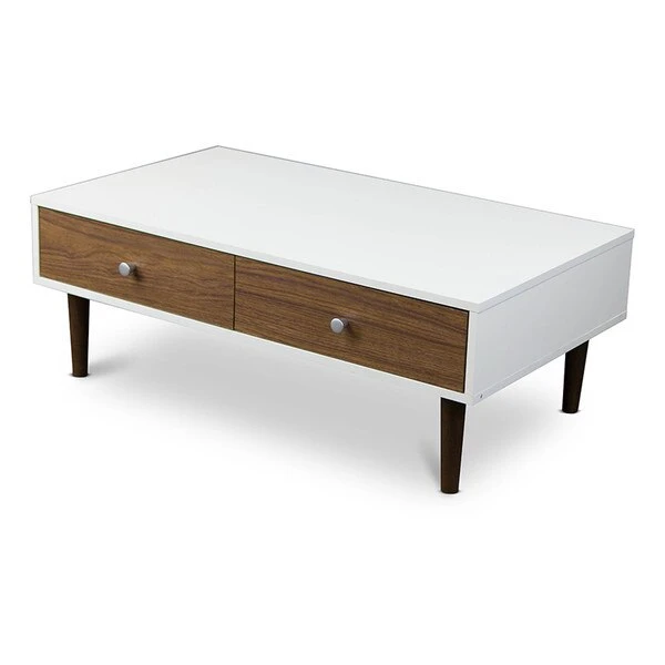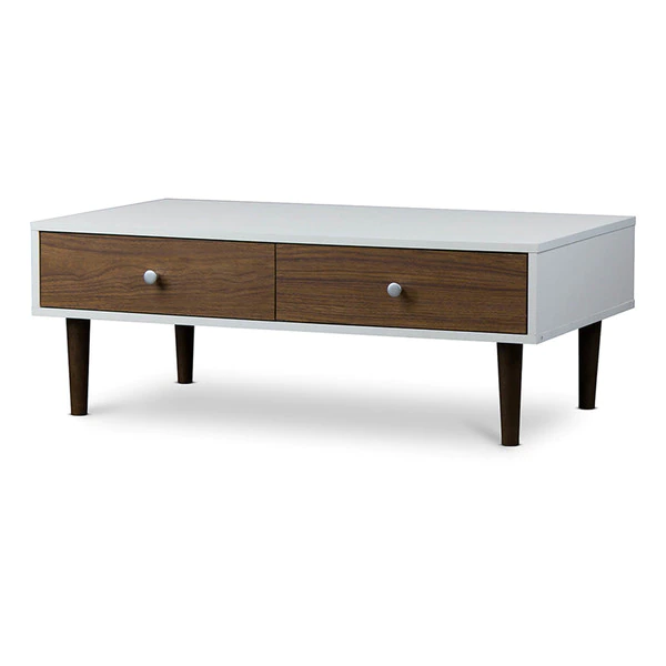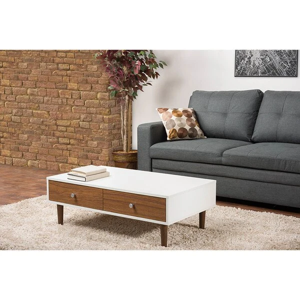 Twin tones intertwine intensely in our Gemini Wood Contemporary Coffee Table. Boasting a compellingly contrasting white-and-walnut faux wood-grain paper veneer, this coffee table will perk up your home. Genuine metal drawer pulls and slim black legs complete the look. Dynamic style at a discount price.