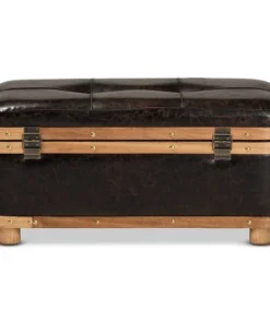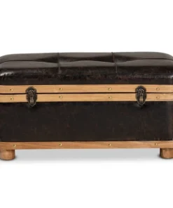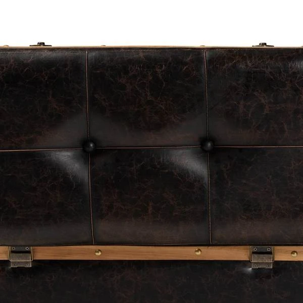 The Gendry storage ottoman blends rustic design with modern utility to organize your space in striking style. Made in China, this ottoman is comprised of a sturdy wood frame upholstered in distressed dark brown faux leather. Its button tufted cushion is padded with plush foam to serve as a cozy footstool or as extra seating when needed. Fully assembled, its top lifts open to reveal spacious storage for blankets, pillows, and more. Oak brown finished wood bands lined with brass finished metal studs lend a contemporary touch that complements the dark upholstery. Ornate antique brass finished handles and latches complete the look, making the Gendry ottoman an outstanding solution to your storage needs.
