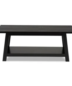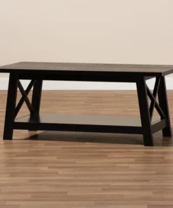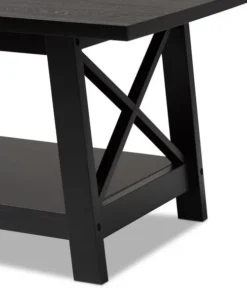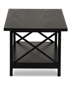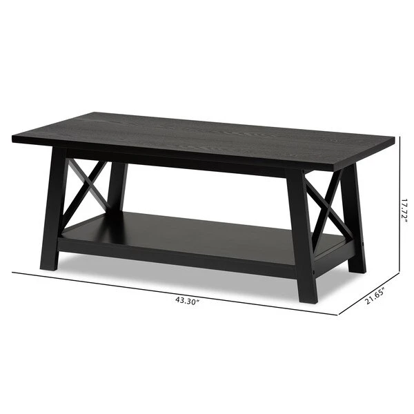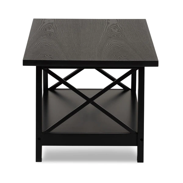Renovate your living room with the stylish and convenient Germain coffee table. The Germain offers a large amount of surface area, as well as a lower shelf to store books, movies, or decorations. Criss-cross beams on either side of the table allow light to flow through and give the living room a pleasant, open feel. Featuring a black finish that complements its simple aesthetic, this wood table requires assembly. Angled legs give the Germain a sleek look while maximizing its utility.