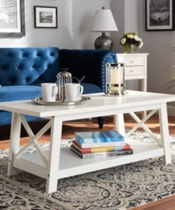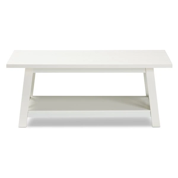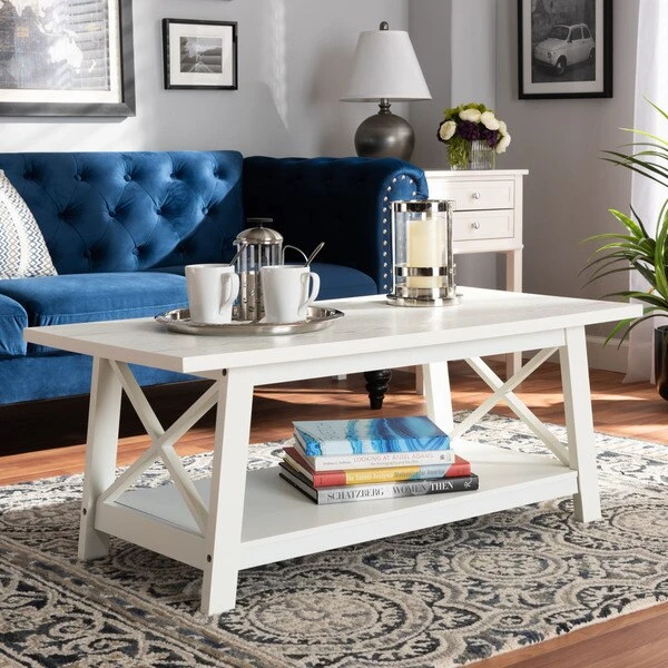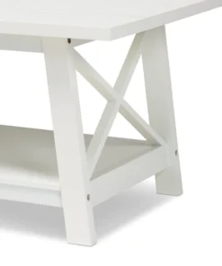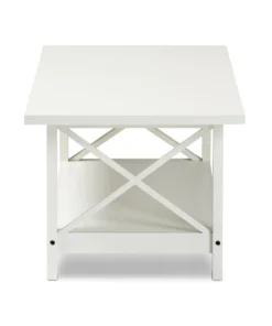 Renovate your living room with the stylish and convenient Germain coffee table. The Germain offers a large amount of surface area, as well as a lower shelf to store books, movies, or decorations. Criss-cross beams on either side of the table allow light to flow through and give the living room a pleasant, open feel. Featuring a white finish that complements its simple aesthetic, this wood table requires assembly. Angled legs give the Germain a sleek look while also maximizing its utility.