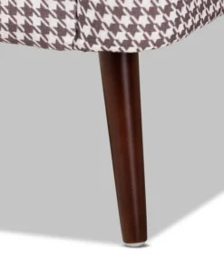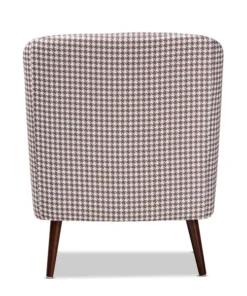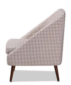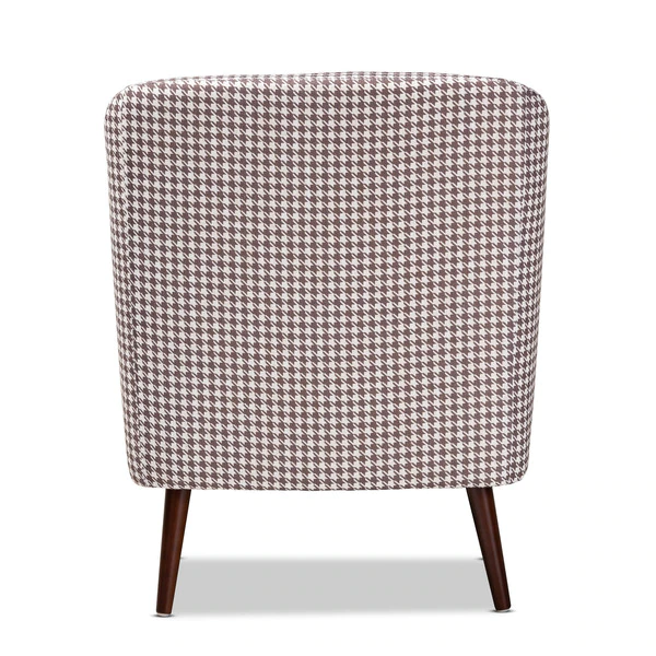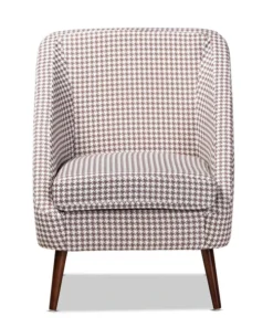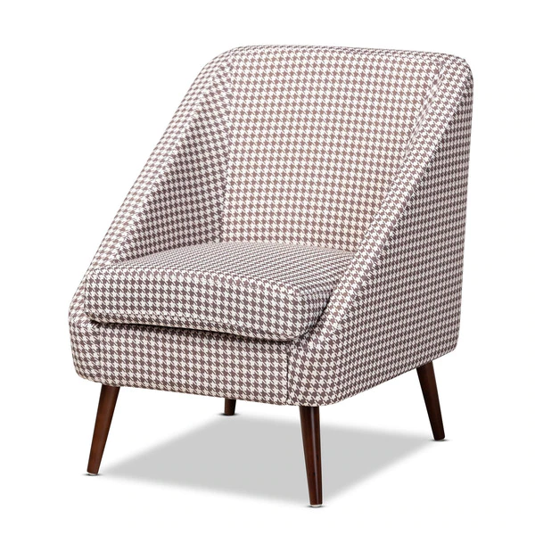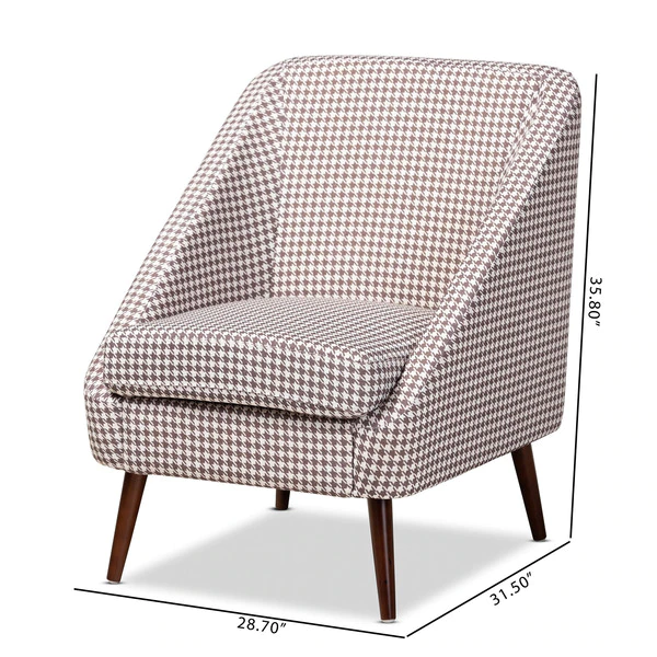 Liven up your living space with the bold sophistication of the Gia accent chair. Featuring long sloping arms and rounded edges, the Gia chair conveys a chic, modern look. Classic brown and white houndstooth fabric upholstery complements the modern silhouette and gives the chair a cool retro vibe. Sturdy walnut brown splayed legs provide solid support. The Gia accent chair requires assembly.