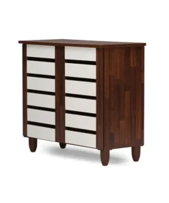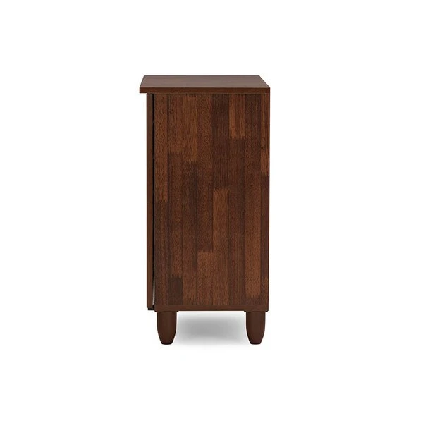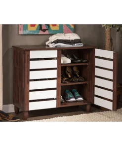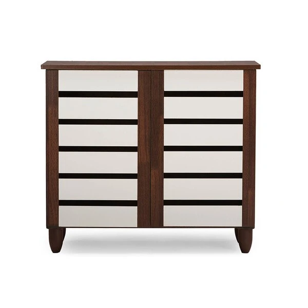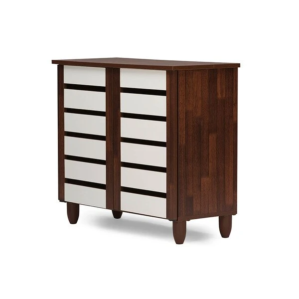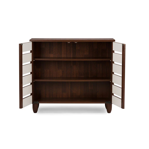With a compact and elegant design, the Gisela series shoe cabinets from Baxton Studio is perfect for houses with space constraints. Two-tone finish for a modern look in dark oak and white will blend in with a variety of décor schemes easily. Functional and beautiful, it makes for a great addition to your home. The shoe cabinet is solidly built with engineered wood in two-tone oak and white finishing. The shoe cabinet has three shelves with two fixed dividers , two doors and legs made of vinyl. The Gisela shoe cabinet requires assembly.