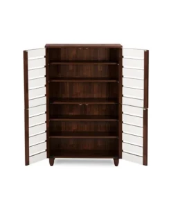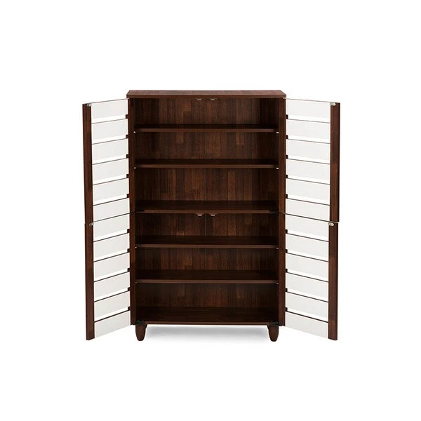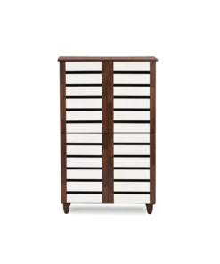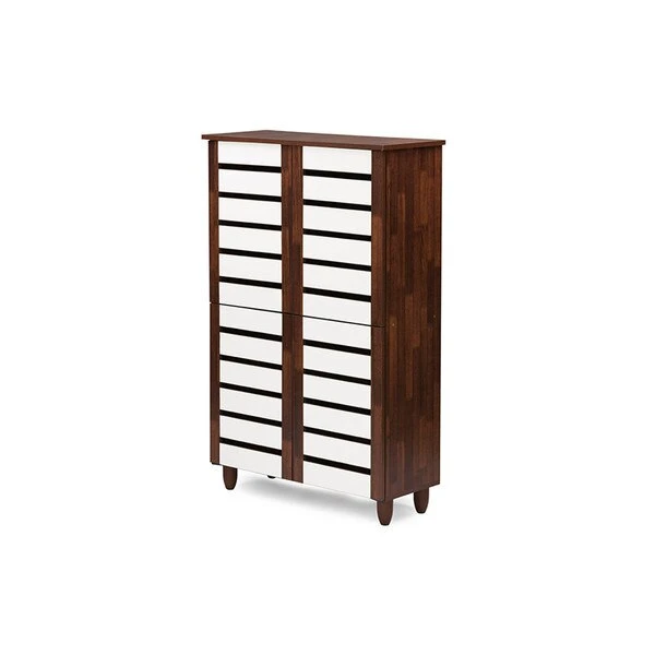 With a compact and elegant design, the Gisela series shoe cabinets from Baxton Studio is perfect for houses with space constraints. Two-tone finish for a modern look in dark oak and white will blend in with a variety of décor schemes easily. Functional and beautiful, it makes for a great addition to your home. The shoe cabinet is solidly built with engineered wood in two-tone oak and white finishing. The shoe cabinet has six shelves with five fixed dividers , four doors and vinyl legs. The Gisela shoe cabinet requires assembly.