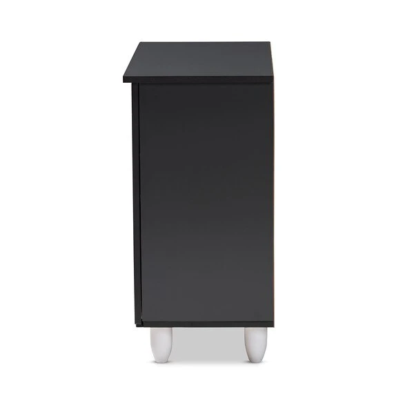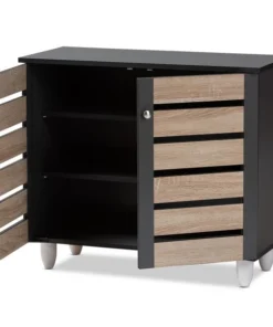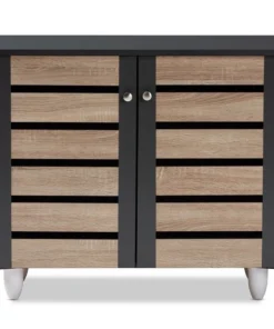 With a compact and elegant design, the Gisela shoe cabinet is perfect for houses with space constraints. Constructed from solid particle board, the Gisela features a two-tone oak and dark grey finish that is easy to coordinate with a wide range of decor styles. Two doors conceal two shelves with storage space for up to nine pairs of shoes. The doors feature open slats to enable air circulation and prevent mold growth on your shoes. White PVC legs provide elevation for easy dusting. The Gisela shoe cabinet requires assembly.