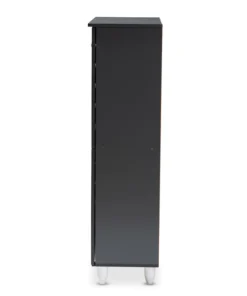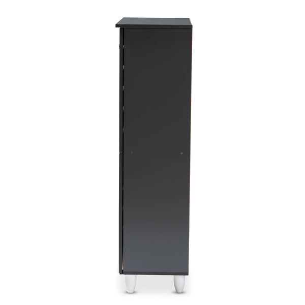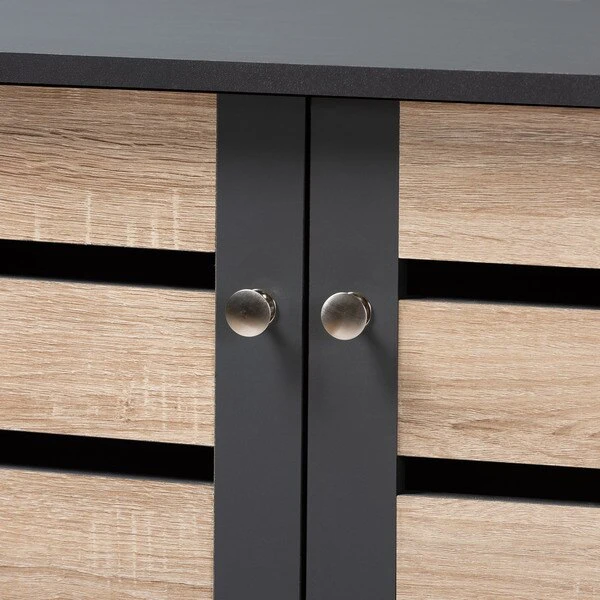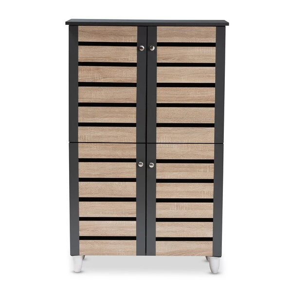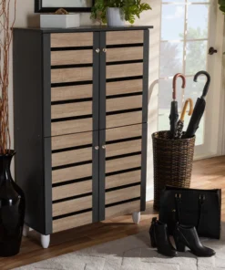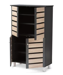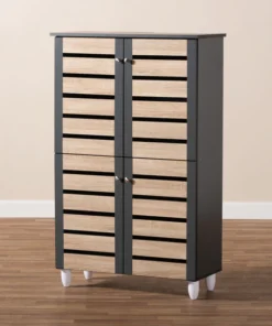 With a compact and elegant design, the Gisela shoe cabinet is perfect for houses with space constraints. Constructed from solid particle board, the Gisela features a two-tone oak and dark grey finish that is easy to coordinate with a wide range of decor styles. Four doors conceal four shelves with storage space for up to 18 pairs of shoes. White PVC legs provide elevation for easy dusting. The Gisela shoe cabinet requires assembly.