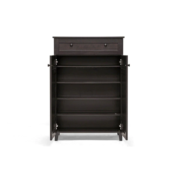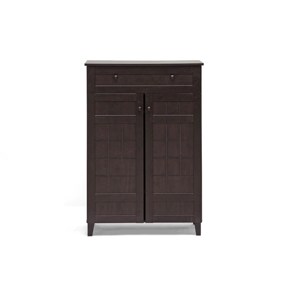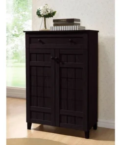 Combining modern and classic elements, our Glidden Designer Shoe Cabinet unobtrusively tucks away shoes yet keeps them close at hand for a quick walk with the dog or trip to the office. This contemporary shoe storage option is made of MDF and engineered wood with dark brown faux wood grain paper veneer: it’s so stylish you’d never guess shoes are inside. Five fixed-height horizontal shelves behind the cabinet doors are ideal for adult and children’s shoes alike, though boots are not recommended. Atop the cabinet doors is a single drawer for additional storage. This designer shoe cabinet requires assembly and should be wiped clean with a dry cloth. For those with fewer storage needs, a shorter version of the Glidden Shoe Cabinet is also available (sold separately). Dimensions: 45.1 inches high x 30.75 inches wide x 15.1 inches deep, Drawer dimensions (1): 2.3 inches high x 26.25 inches wide x 10.5 inches deep, Shelf dimensions (4): 6.5 inches high x 28.6 inches wide x 11.6 inches deep.