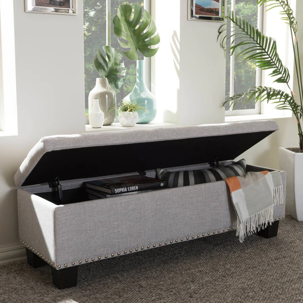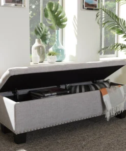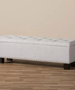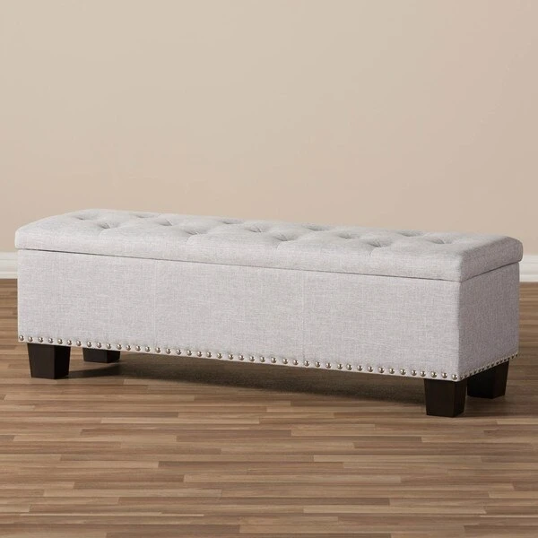 For hidden storage that doubles as additional seating, opt for the modern and contemporary style and comfortable finish of the Hannah storage ottoman bench. Constructed of eco-friendly solid rubberwood frame for sturdiness and durability, the Hannah storage ottoman bench is upholstered in soft polyester blend fabric available in your choice of beige, greyish beige, dark grey or light blue color for a neutral or statement look. The hinged lid includes a cushioned finish for plush comfort, making storage box suitable as extra seating. Beautifully finished with silver nail heads trim, the storage bench features diamond-shaped button-tufting design with deep storage space for added functionality. A versatile piece perfect for storing linens or cushions, the Hannah creates a spot of contemporary style with the benefit of hidden storage. To complete the look, the storage trunk is sitting on four solid rubberwood chunky feet for a strong foundation. The Hannah will be perfect as a bed end bench for your bedroom or as an accent piece in your living space. The storage bench requires minor assembly.