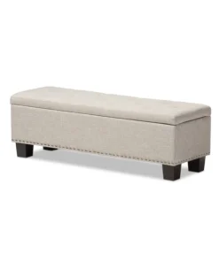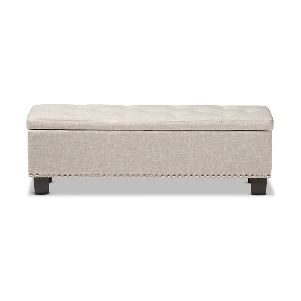 For hidden storage that doubles as additional seating, opt for the modern and contemporary style and comfortable finish of the Hannah storage ottoman bench. Constructed of eco-friendly solid rubberwood frame for sturdiness and durability, the Hannah storage ottoman bench is upholstered in soft polyester blend fabric available in your choice of beige, greyish beige, dark grey or light blue color for a neutral or statement look. The hinged lid includes a cushioned finish for plush comfort, making storage box suitable as extra seating. Beautifully finished with silver nail heads trim, the storage bench features diamond-shaped button-tufting design with deep storage space for added functionality. A versatile piece perfect for storing linens or cushions, the Hannah creates a spot of contemporary style with the benefit of hidden storage. To complete the look, the storage trunk is sitting on four solid rubberwood chunky feet for a strong foundation. The Hannah will be perfect as a bed end bench for your bedroom or as an accent piece in your living space. The storage bench requires minor assembly.