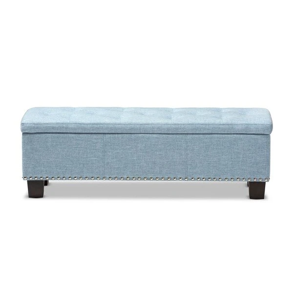 For hidden storage that doubles as additional seating, opt for the modern and contemporary style and comfortable finish of the Hannah storage ottoman bench. Constructed of eco-friendly solid rubberwood frame for sturdiness and durability, the Hannah storage ottoman bench is upholstered in soft polyester blend fabric available in your choice of beige, greyish beige, dark grey or light blue color for a neutral or statement look. The hinged lid includes a cushioned finish for plush comfort, making storage box suitable as extra seating. Beautifully finished with silver nail heads trim, the storage bench features diamond-shaped button-tufting design with deep storage space for added functionality. A versatile piece perfect for storing linens or cushions, the Hannah creates a spot of contemporary style with the benefit of hidden storage. To complete the look, the storage trunk is sitting on four solid rubberwood chunky feet for a strong foundation. The Hannah will be perfect as a bed end bench for your bedroom or as an accent piece in your living space. The storage bench requires minor assembly.