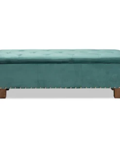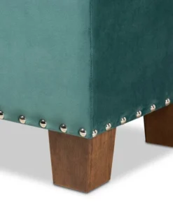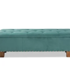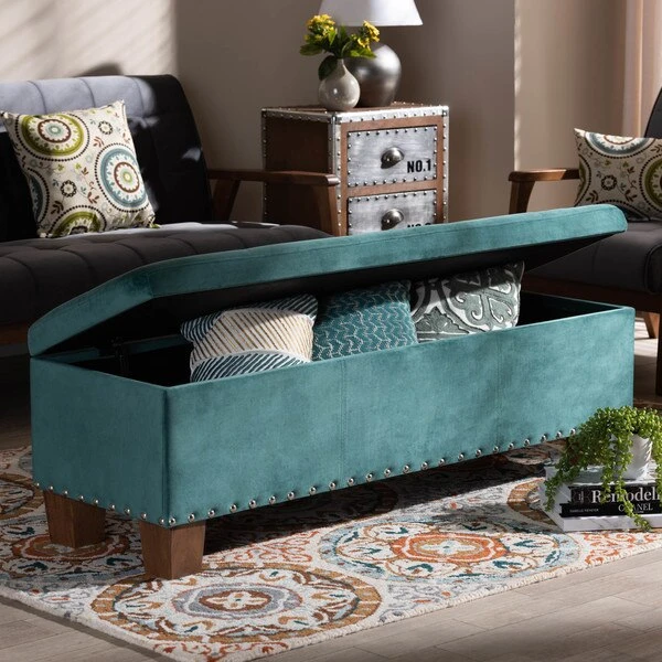 For hidden storage that doubles as seating, opt for the Hannah storage bench. Constructed from rubberwood, the bench is upholstered in a soft velvet fabric that adds a dose of glamour to your space. The elegant button tufted top is foam padded for seating comfort and opens to reveal ample storage space for extra blankets and linens. Silver nail heads and walnut finished block feet lend a chic, modern look. The Hannah is well suited for use as a bed end bench in your bedroom or as an accent piece in your living room. The Hannah storage bench requires leg assembly.