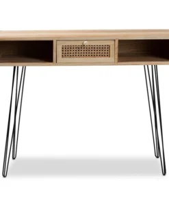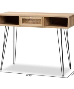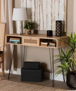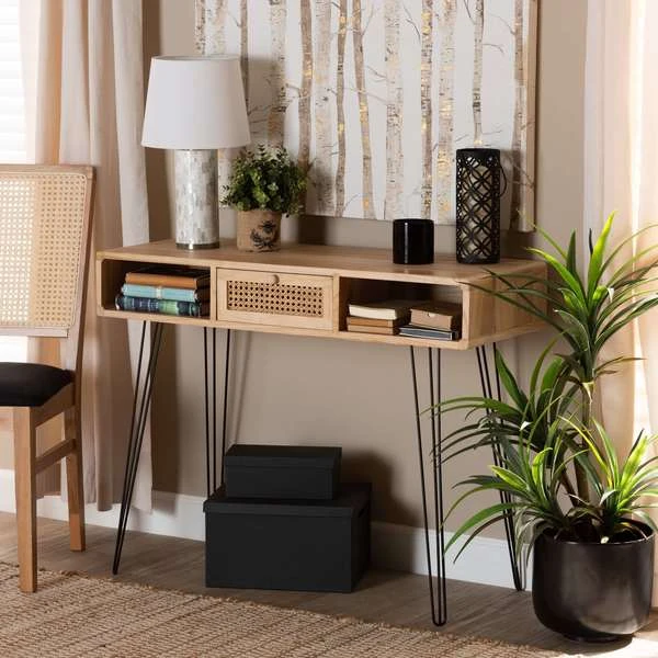 The eye-catching design of the Harrell console table transforms any common area of your home. Made in China, this table is comprised of a sturdy wood frame support by minimalist metal legs. Two open shelves and one drawer offer space to organize household essentials and reserve the wide tabletop as a display for decorations. Requiring assembly, the Harrell is supported by hairpin legs that convey a unique, retro feel. Rattan accents complete the look, making the Harrell console table a charming addition to any space.