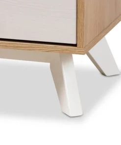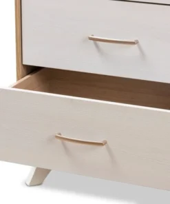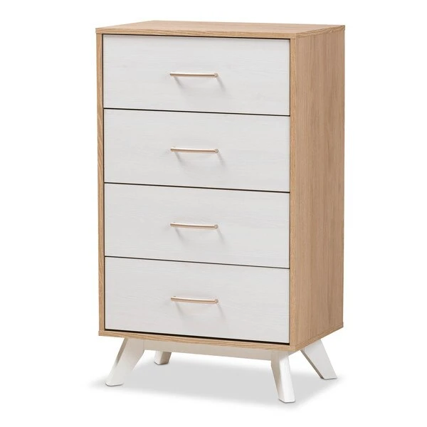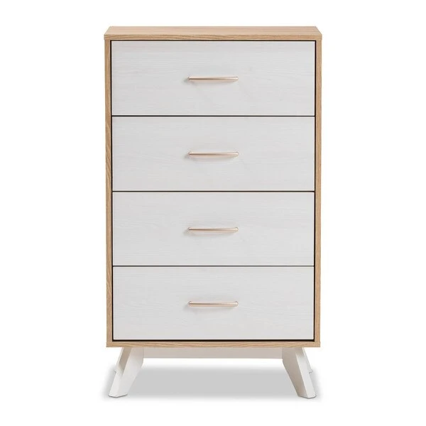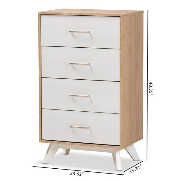 Imparts a touch of mid-century modern style lines into your bedroom, Helena creates an eye-catching feature in your space. Constructed of engineered wood and MDF boards for sturdiness, the chest features four pull-out drawers on metal runners for a smooth movement for your clothes and bedroom essentials. Finished in natural oak and whitewashed veneer for a contrasting good look, the Helena is accented with sleek metal handles in rose gold for simple functionality with contemporary looks. White solid wood angled legs, in a tapered design for a Scandinavian touch in your décor hold up the chest sturdily. The Helena requires assembly.