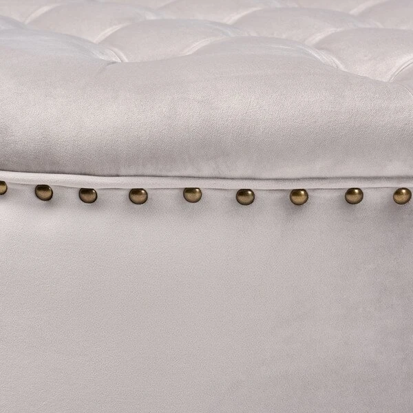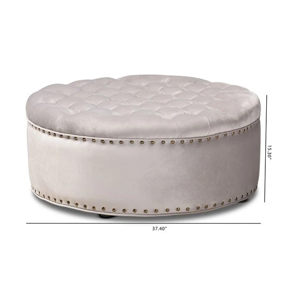 A cut above the rest, the Iglehart ottoman will exceed your expectations. This beautiful living area centerpiece is made with a sturdy eucalyptus wood frame, firm foam cushioning, and velvet fabric upholstery. Finishing touches include antiqued brass upholstery tacks and black wood legs with non-marking feet. The Iglehart ottoman will arrive fully assembled.
