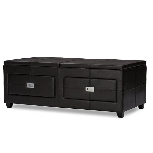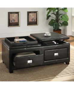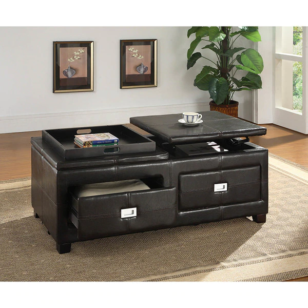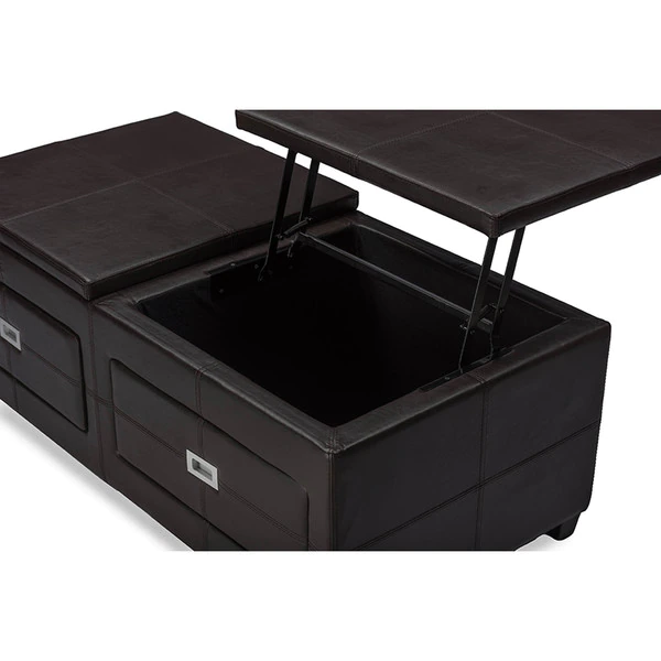 This contemporary multi-functional cocktail table is the perfect piece to complete your living room ensemble. Chocolate leather-like surface brings a warm, sophisticated ambiance. A spacious lift-top feature makes holding drinks and objects easy and within reach. Store various living room accessories such as remotes, DVDs, and books in the two spacious storage drawers. Made with hardwood and plywood frame, the Cocktail ottoman table is sturdy. Attractive silver hardware is in use for a fresh and urban style.