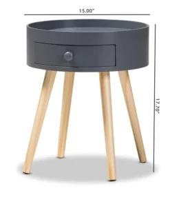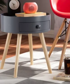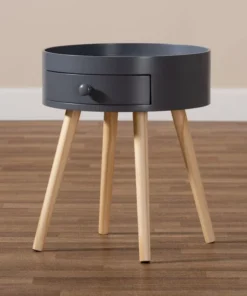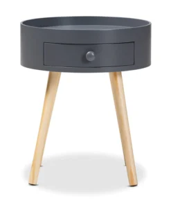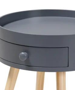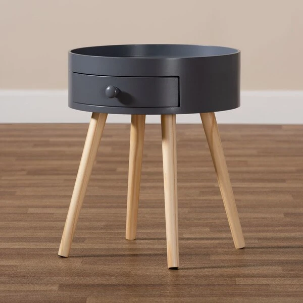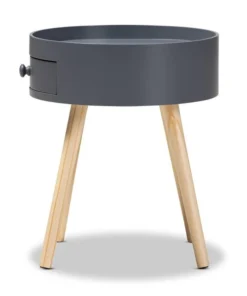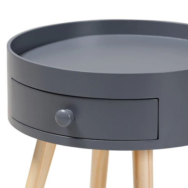 Add cool, quirky style to your bedroom with the Jessen nightstand. The Jessen features a tray-style top, ideal for keeping phones and other items secure. One drawer, fitted with a round knob, provides space to store bedside essentials. Functional and stylish, the Jessen showcases a sleek neutral finish that is complimentary to a wide range of color palettes. Angled wood legs add a stylish mid-century feel. The Jessen nightstand requires assembly.